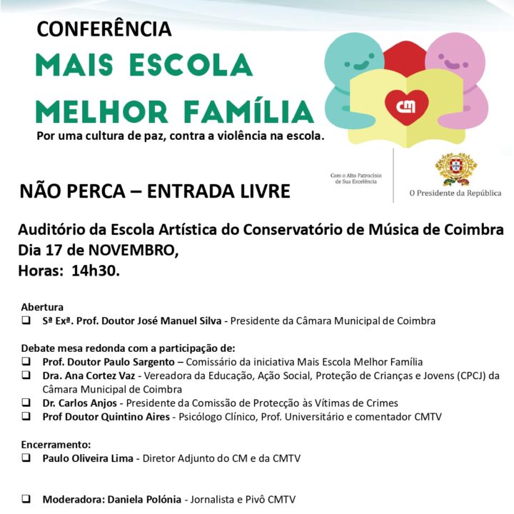 A CM de Coimbra apoia a realização do terceiro debate da iniciativa “Mais escola, melhor família”, organizada pelo Correio da Manhã (CM) e pela CMTV, que vai decorrer em Coimbra, amanhã, dia 17 de novembro, a partir das 14h30, no auditório do Conservatório de Música de Coimbra, com o alto patrocínio da Presidência da República, e que vai sentar à mesa vários especialistas para debater o bullying nas escolas.