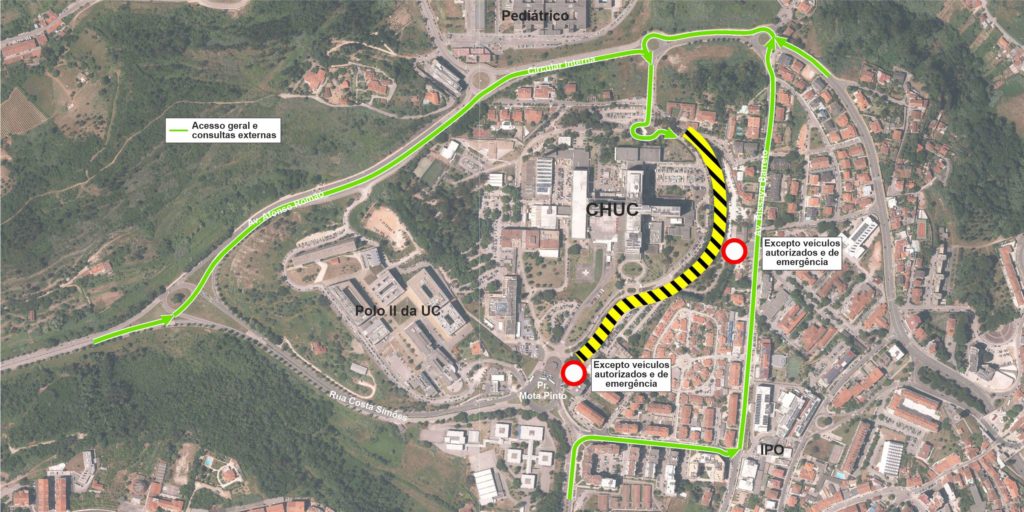 Assim, no período indicado, o acesso geral ao CHUC e às consultas externas será efetuado pela entrada Norte, a partir da Rua Afonso Romão (Circular Interna), ficando as entradas da Praceta Carlos da Mota Pinto e Avenida Bissaya Barreto condicionadas exclusivamente a veículos autorizados e de emergência.