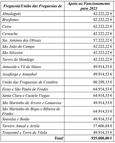 Importa sublinhar que o apoio ao funcionamento das Freguesias/UF inscrito nas GOP para 2023 reflete todo o processo de descentralização em curso da CM de Coimbra nas Freguesias/UF. Assim, para além deste apoio ao funcionamento de 935 mil euros, está previsto um montante de cerca de 1,4 milhões de euros (M€) para contratos interadministrativos de delegação de competências em matéria de obras; cerca de 3,5M€ para o exercício de transferência de competências; e, ainda, um montante em negociação para as competências delegadas, em matérias de Proteção Civil. Estes apoios perfazem um total que pode ascender aos 6M€.