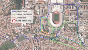 Assim, o fluxo de trânsito da Rua do Brasil com destino à zona da Casa Branca será canalizado para a Rua dos Combatentes da Grande Guerra – Rua do Estádio – Rua D. Manuel I – Rua D. João III – Rua Eng. Jorge Anjinho – Rua Monsenhor Nunes Pereira.