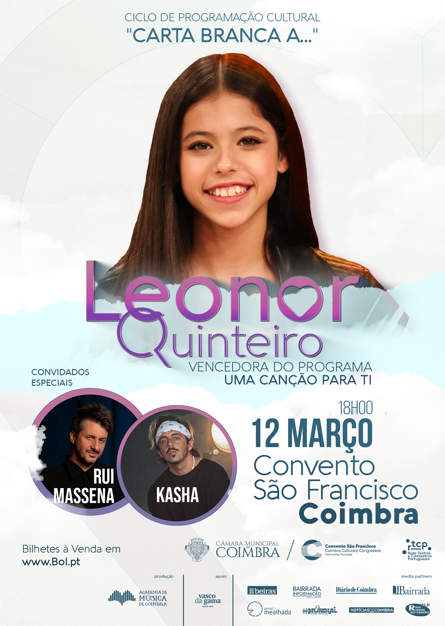 Leonor Quinteiro vai regressar aos grandes palcos pela mão da Câmara Municipal de Coimbra e estrear a nova rubrica programática do CSF, intitulada “Carta Branca a…”, que pretende promover jovens talentos naturais ou residentes no concelho, com a realização de espetáculo dirigidos por uma personalidade de relevo da área artística em questão. Um projeto que reflete a nova estratégia cultural promovida pela autarquia, com uma aposta clara nos novos talentos naturais ou residentes do concelho nas várias áreas artísticas. Esta rubrica vai repetir-se quatro a cinco vezes por ano e é uma forma da autarquia acompanhar de perto o percurso destes jovens talentos.
