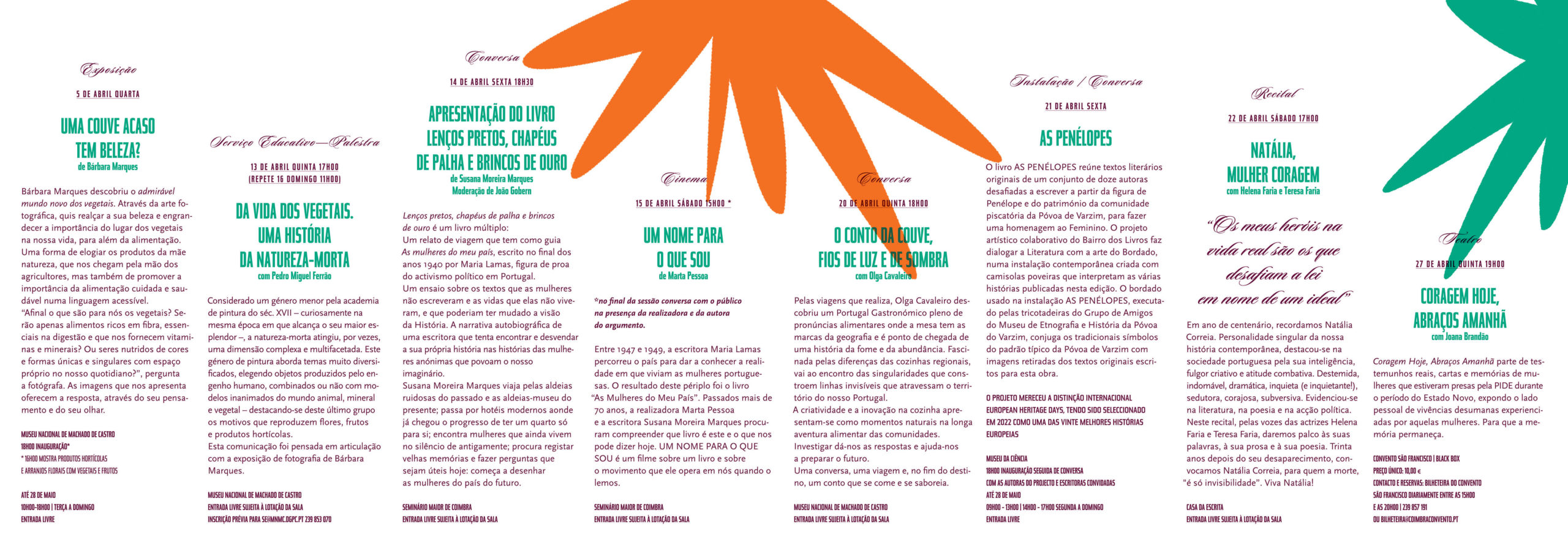 A programação inclui, ainda, uma exposição de fotografia “Uma couve acaso tem beleza?”, de Bárbara Marques, que poderá ser visitada no Museu Nacional Machado de Castro, bem como uma conversa conduzida por Olga Cavaleiro, que se intitula “O conto da couve, fios de luz e de sombra”, e que terá lugar no dia 20 de abril. Destaque, também, para a instalação “As Penélopes”, que faz “dialogar a literatura com a arte do bordado” e que chega ao Museu da Ciência em 21 de abril.