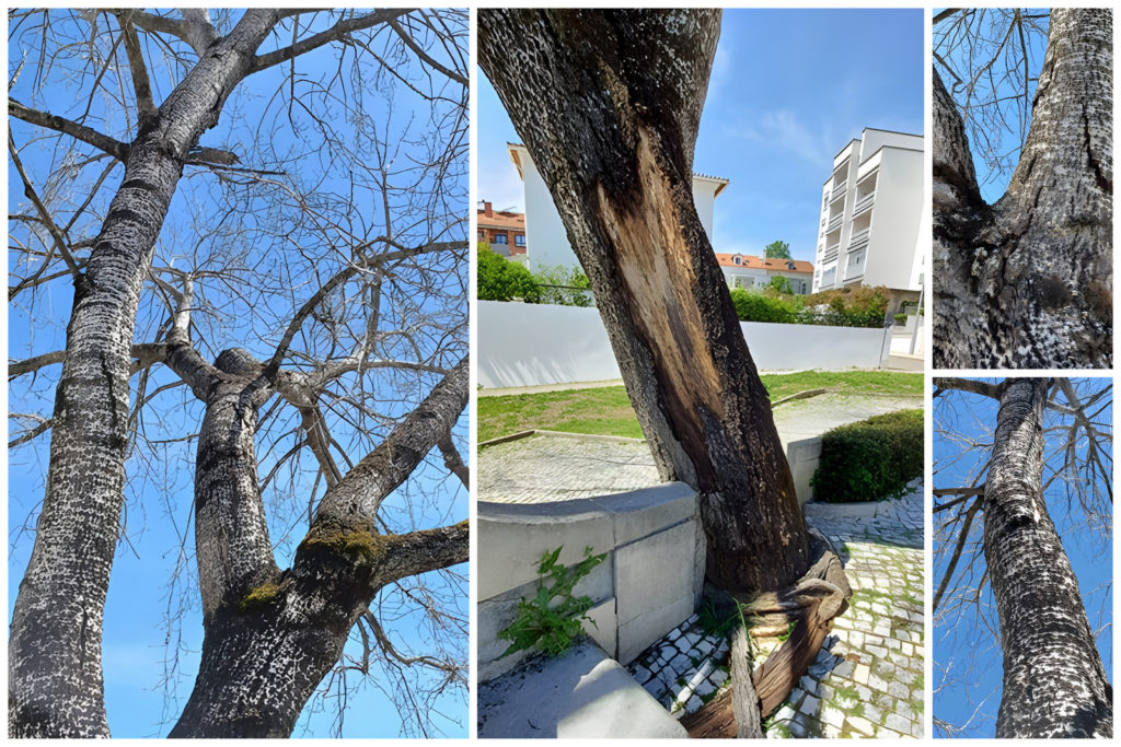 Esta ação deve-se ao facto da árvore se encontrar totalmente seca, com evidências de descolamento da casca e fissuras em ramos e pernadas, potenciando a probabilidade de rutura de partes da sua estrutura situação que é potencialmente perigosa e de iminente risco para pessoas e bens, agravada pelo facto de se tratar de um jardim com elevado uso.