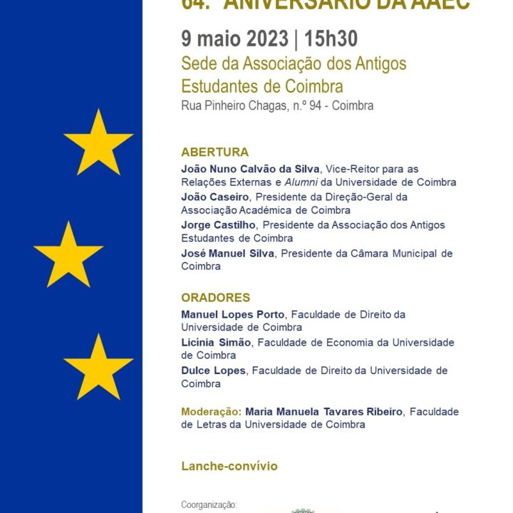 Mais tarde, pelas 15h30, está marcado um debate sobre o Dia da Europa. Uma iniciativa coorganizada pela Câmara Municipal, Universidade de Coimbra (UC), Associação Académica de Coimbra (AAC) e Associação dos Antigos Estudantes de Coimbra (AAEC), que terá lugar na sede da AAEC, na rua Pinheiro Chagas, n.º 94. A sessão de abertura está a cargo do presidente da Câmara, José Manuel Silva, do vice-reitor da UC, João Nuno Calvão da Silva, do presidente da Direção-Geral da AAC, Pedro Caseiro e do presidente da direção da AAEC, Jorge Castilho. O debate vai ser moderado por Maria Manuela Tavares Ribeiro e as intervenções serão produzidas por Manuel Lopes Porto, Dulce Lopes e Licínia Simão.