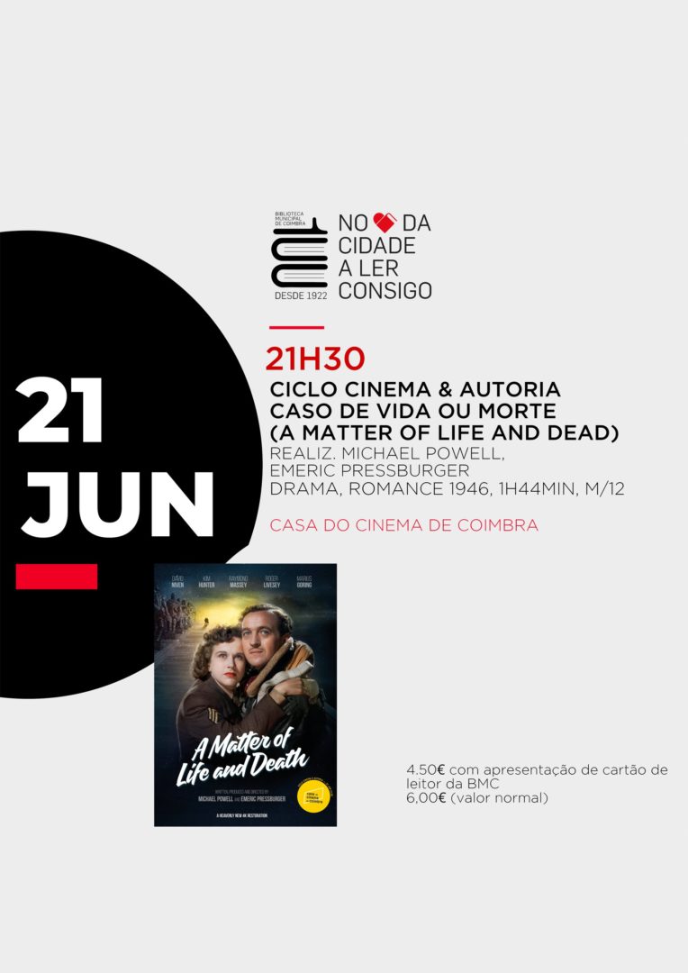 A Casa do Cinema de Coimbra apresenta, amanhã, às 21h30, na sessão integrada no Ciclo Cinema e Autoria, o filme “Caso de vida ou morte” (título original: “A matter of life and death”) dos realizadores Michael Powell e Emeric Pressburger, com a participação de David Niven e Kim Hunter no elenco. A sessão será comentada por Fernando Fausto de Almeida.
