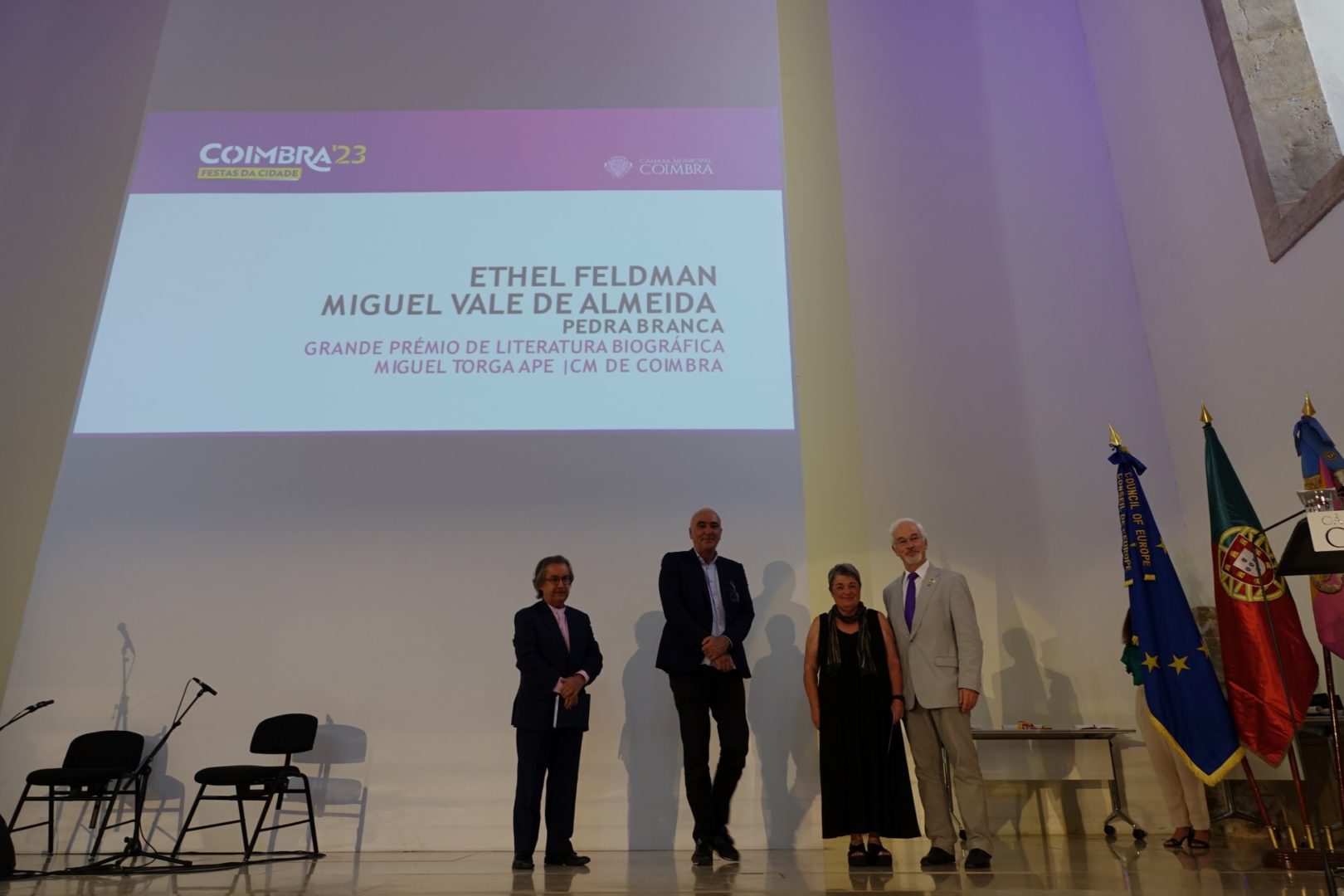 Na sessão foi também entregue a Ethel Feldman e Miguel Vale de Almeida, autores do livro “Pedra Branca”, editado pela Caminho, o Grande Prémio de Literatura Biográfica Miguel Torga, no âmbito de uma parceria da Câmara Municipal de Coimbra com a Associação Portuguesa de Escritores (APE), que está a comemorar 50 anos de atividade. Depois de um elogio à obra feito por Cristina Robalo Cordeiro, António Pedro Pita, em representação da APE, agraciou e entregou o prémio aos dois autores.