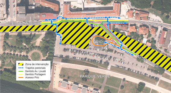 Finalmente, a natureza da intervenção exige que o acesso norte do parque de estacionamento do Parque Verde do Mondego, que funciona como saída, fique inacessível, ficando apenas disponível o seu acesso sul (junto ao Pavilhão de Portugal), que presentemente funciona apenas como entrada. Assim, este último acesso deverá passar, temporariamente, a funcionar simultaneamente como entrada e saída do parque de estacionamento.