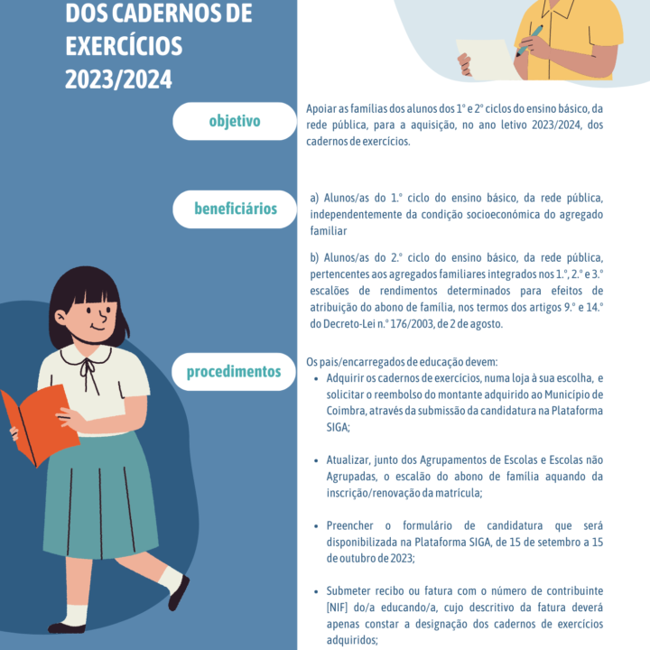 A forma como o apoio é dado também sofre, este ano, uma alteração. Os pais e encarregados/as de educação devem adquirir os cadernos de exercícios numa loja à sua escolha e solicitar, posteriormente, o reembolso do montante junto da Câmara Municipal, através da submissão de uma candidatura na Plataforma SIGA. Recorde-se que é necessário atualizar, junto dos Agrupamentos de Escolas e Escolas não Agrupadas, o escalão do abono de família aquando da inscrição/renovação da matrícula. “O PS fazia um concurso fora do concelho de Coimbra e distribuía os cadernos. Assim, os pais compram os cadernos no comércio local e depois são ressarcidos”, justificou o presidente da CM de Coimbra na reunião de segunda-feira.