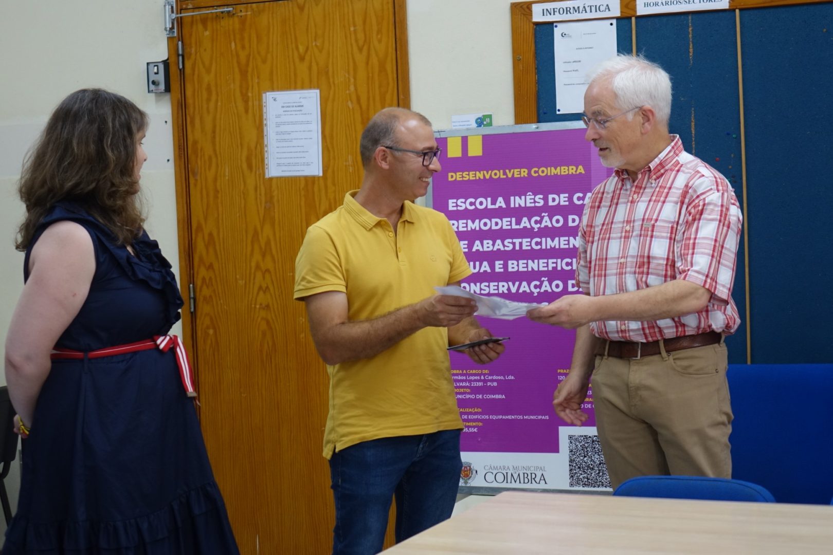 O presidente da CM de Coimbra, José Manuel Silva, acompanhado da vereadora da Educação, Ana Cortez Vaz, marcou presença na consignação de uma empreitada relativa à EB2,3 Inês de Castro, que integra o Agrupamento de Escolas Coimbra Oeste. A intervenção, com o um investimento de 208.958 euros (sem IVA), vai incidir sobre a rede de abastecimento de água no interior e no exterior da escola e vai também incluir trabalhos de beneficiação e de conservação das coberturas. “Com esta intervenção, há muito reivindicada pelo estabelecimento escolar e consecutivamente adiada, pretendemos, finalmente, dar mais um passo para dotar este estabelecimento escolar de maior conforto e dignidade para toda a comunidade”, salientou Ana Cortez Vaz.
