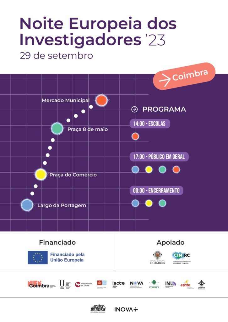 A Noite Europeia dos Investigadores é um evento de Comunicação de Ciência que decorre anualmente, em várias cidades da Europa, com o propósito de promover a sensibilização e o envolvimento da população na Ciência, aproximando os investigadores e a sociedade civil. A CM de Coimbra associa-se à iniciativa, que vai decorrer entre as 14h00 e as 24h00 de sexta-feira, na Baixa de Coimbra, e assume uma programação diversificada e dirigida à comunidade escolar e ao público em geral.