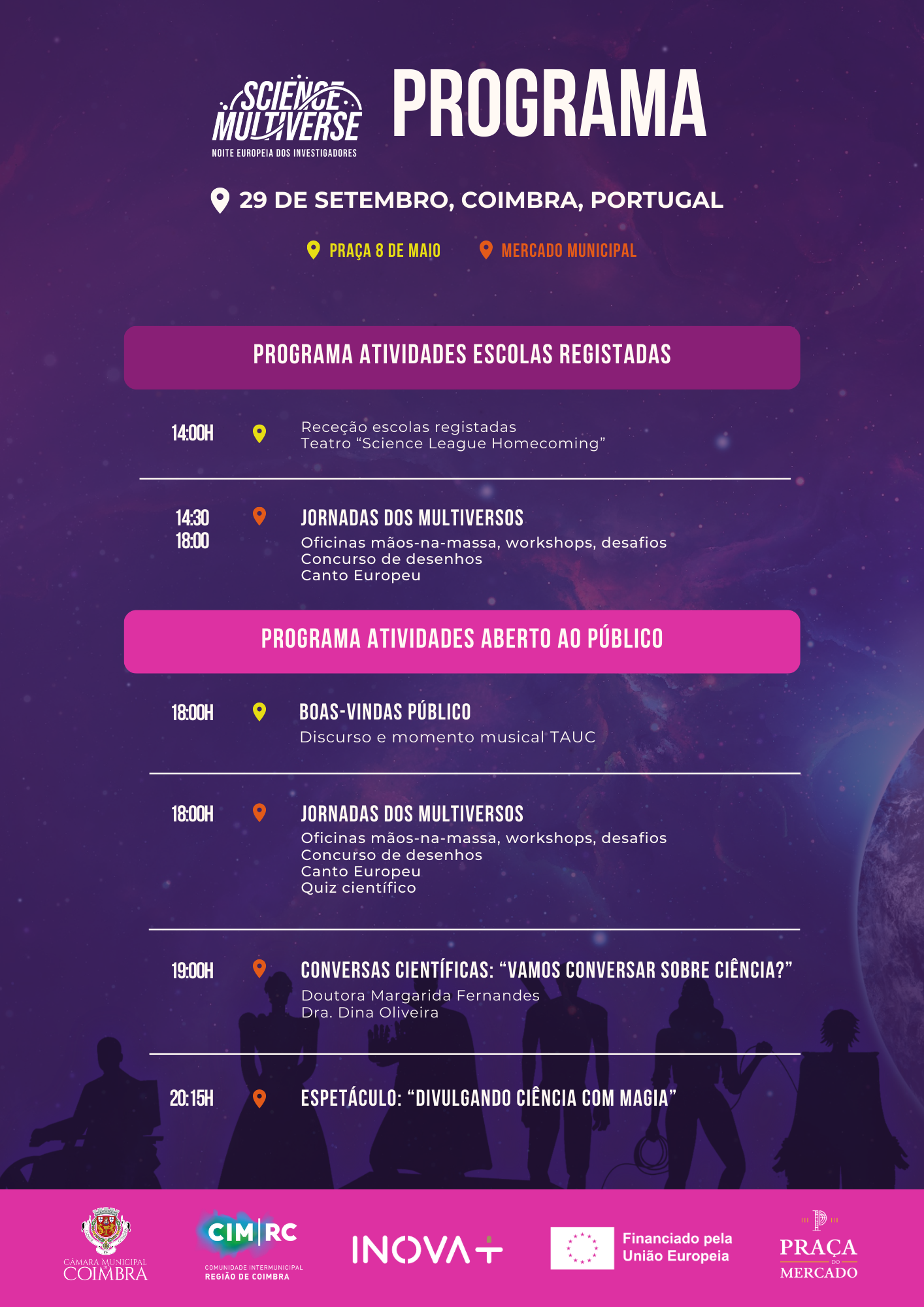 O Science Multiverse é um dos projetos que vai integrar a Noite Europeia dos Investigadores Uma iniciativa coordenada pelo INOVA+ e dedicada a celebrar e a promover a aprendizagem da ciência de uma forma divertida, através da realização de atividades lúdico-pedagógicas. As atividades vão acontecer no Mercado Municipal D. Pedro V e são dirigidas, das 14h00 às 18h00, à comunidade escolar do 1.º Ciclo do Ensino Básico e do Ensino Secundário, podendo o público em geral participar a partir dessa hora.