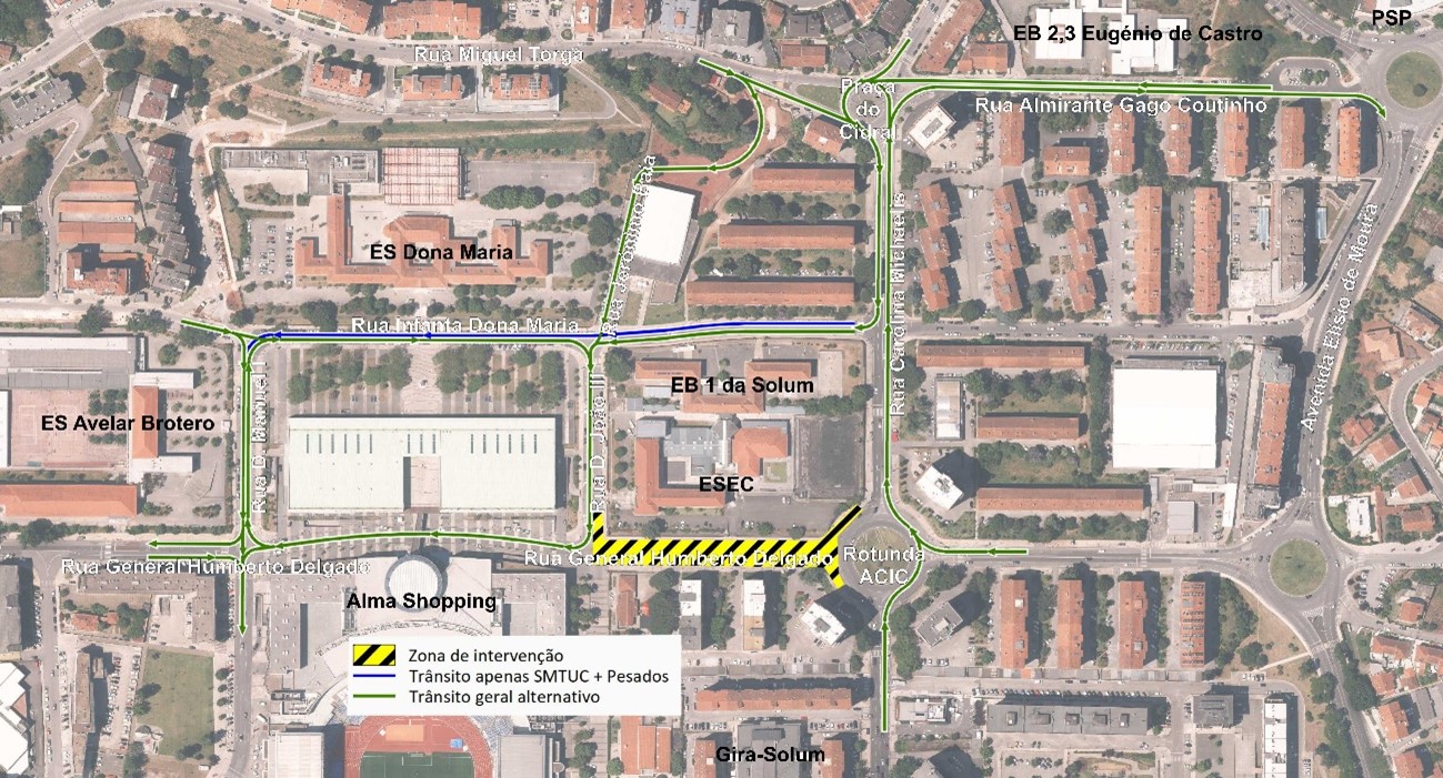 Assim, o fluxo de trânsito da Rua Carolina Michaelis e Rua João de Deus Ramos, em direção ao Centro Comercial Alma Shopping, será canalizado para a Rotunda da Praça do Cidral, contornando-a, com possibilidade de virar para a Rua Infanta Dona Maria e de seguida descer a Rua Dom João III, junto à Escola Superior de Educação.