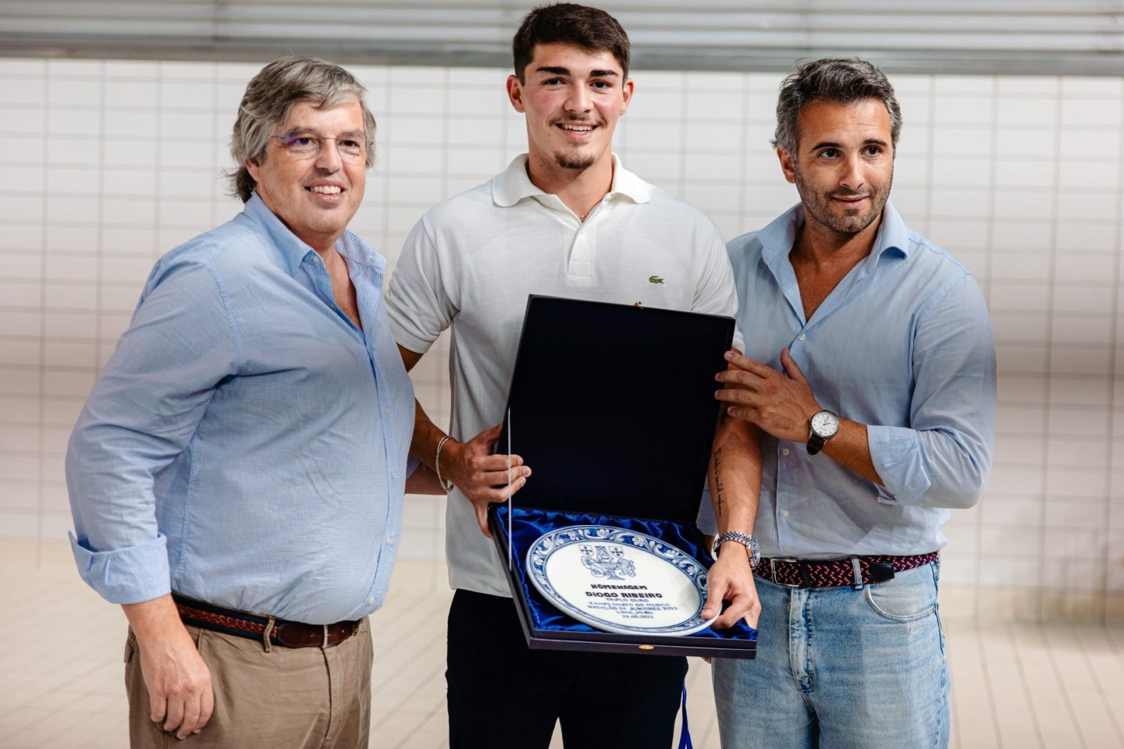 A homenagem do Município de Coimbra traduziu-se ainda com a entrega de um prato de mérito desportivo. Quanto à lona de grandes dimensões com a mensagem “Obrigado Diogo!”, produzida com o apoio da empresa Golfinho – uma empresa de Coimbra de artigos de natação, simboliza ainda um incentivo a todos os atletas do concelho que treinam no Complexo Desportivo e Centro de Alto Rendimento de Natação, local frequentado por Diogo Ribeiro no início da sua carreira.