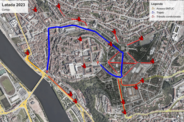 Já para o Cortejo da Latada, dia 8, vai haver corte de trânsito na rua Larga, largo D. Dinis, rua Martim de Freitas, praça João Paulo II, rua Alexandre Herculano, praça da República, avenida Sá da Bandeira (sentido ascendente), rua Olímpio Nicolau Rui Fernandes, praça 8 de Maio, rua Visconde da Luz, rua Ferreira Borges e términus no largo da Portagem, entre as 12h00 e as 22h00 do dia 8 de outubro de 2023. Vai ser, ainda, proibido estacionar das 00h00 até às 24h00 de dia 8, na rua dos Estudos, praça D. Dinis, calçada Martin de Freitas, dos dois lados da via na rua Alexandre Herculano e no sentido ascendente da avenida Sá da Bandeira.