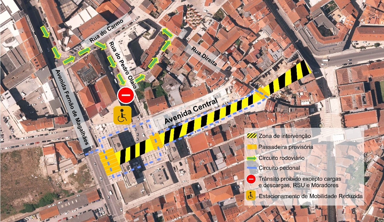 Assim, durante esta intervenção, o acesso rodoviário à Loja de Cidadão será realizado pela Rua do Carmo e parte da Rua Pedro Olaio. Os lugares de carga e descarga e para pessoas de mobilidade reduzida localizados atualmente junto à loja de Cidadão serão relocalizados na Rua Pedro Olaio, conforme representado na imagem acima.