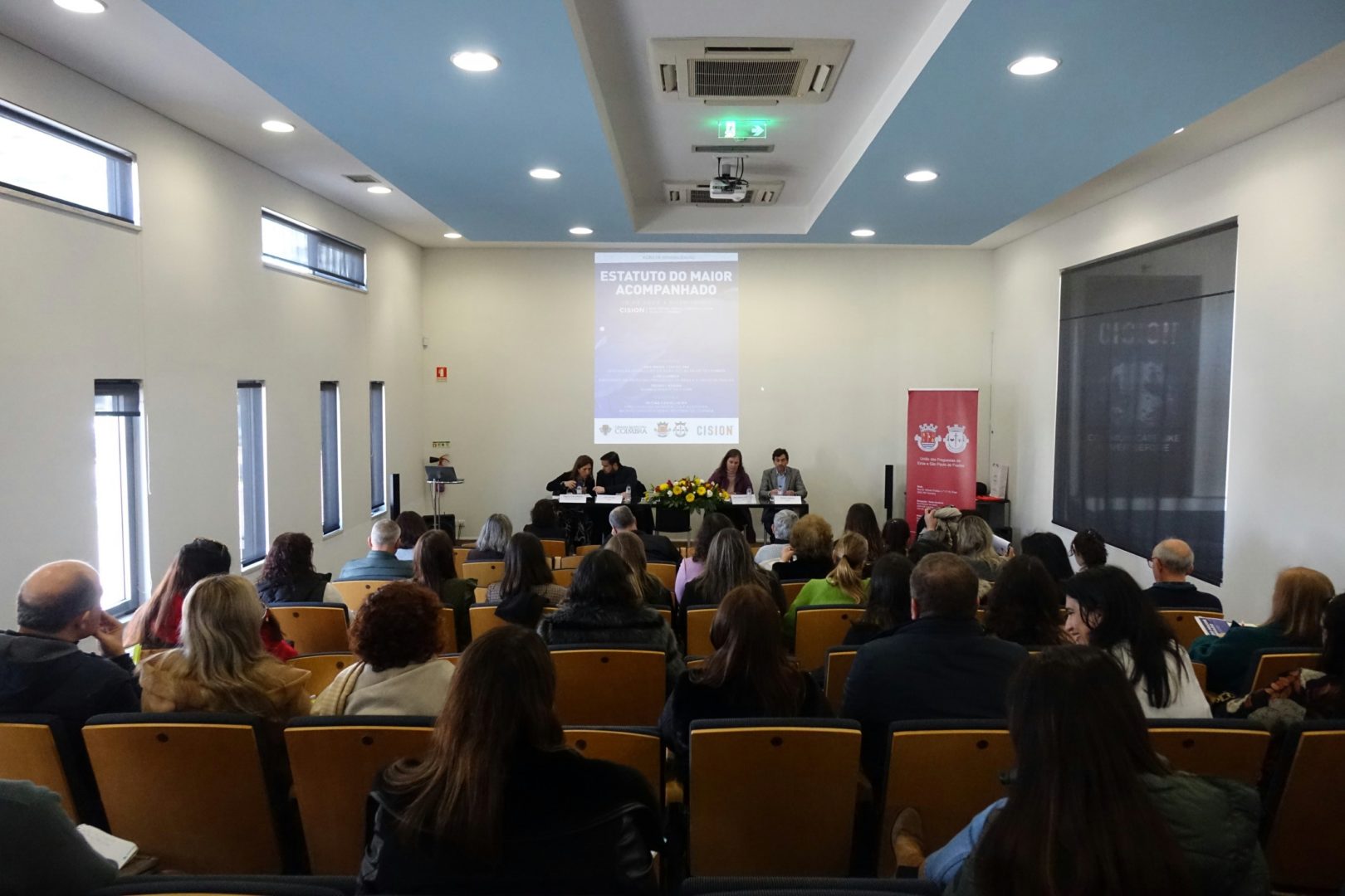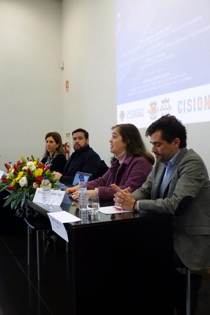 O edifício da CISION, em Eiras, acolheu ontem, dia 28 de fevereiro, uma ação de sensibilização sobre o “Estatuto do Maior Acompanhado”, promovida pelo Gabinete de Apoio Social da União de Freguesias (UF) de Eiras e São Paulo de Frades, em consonância com as propostas discutidas na Comissão Social dessa freguesia. A vereadora da Ação Social da Câmara Municipal (CM) de Coimbra participou na sessão de abertura do evento, que contou também com Pedro Ladeira, da CISION, Luís Correia, presidente da UF de Eiras e S. Paulo Frades, e a oradora convidada, Regina Corvo, procuradora da República e assessora na Procuradoria-Geral Regional de Coimbra.