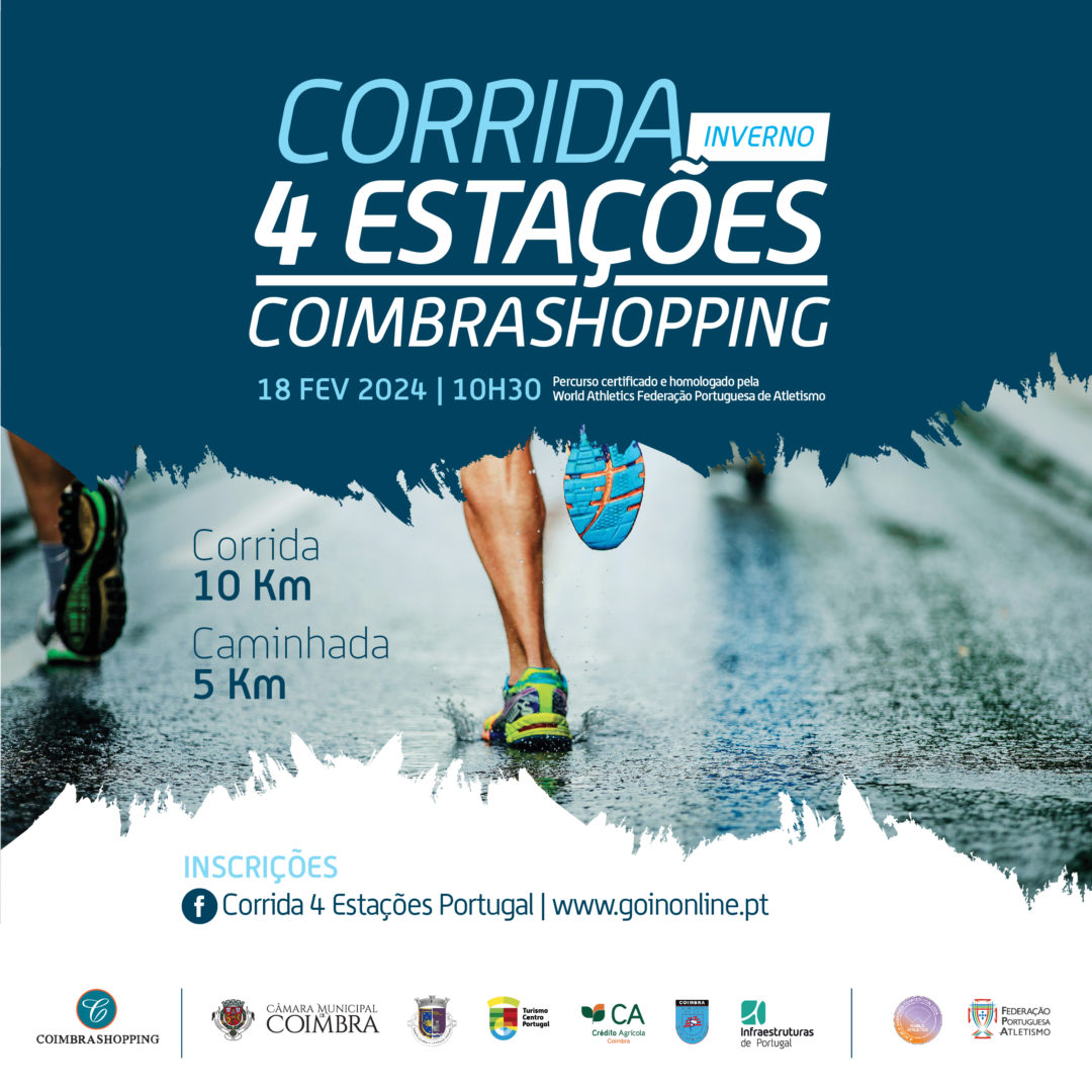 A Corrida 4 Estações está na rua no próximo dia 18 de fevereiro, com partida e chegada da Praça da Canção. A prova, que conta com vertente de corrida de 10 km e caminhada de 5 km, conseguiu o reforço do apoio do Coimbra Shopping, que passa a dar, assim, o nome à corrida, e mantém o apoio da Câmara Municipal de Coimbra e da União de Freguesias de Santa Clara e Castelo Viegas.