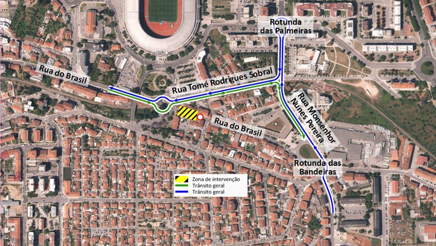 Assim, durante o condicionamento não será possível aceder diretamente da Rotunda das Bandeiras à parte poente da Rua do Brasil, sendo a alternativa efetuada pela Rua Monsenhor Nunes Pereira, invertendo a marcha na Rotunda das Palmeiras e prosseguindo pela Rua Tomé Rodrigues Sobral até à Rua do Brasil.