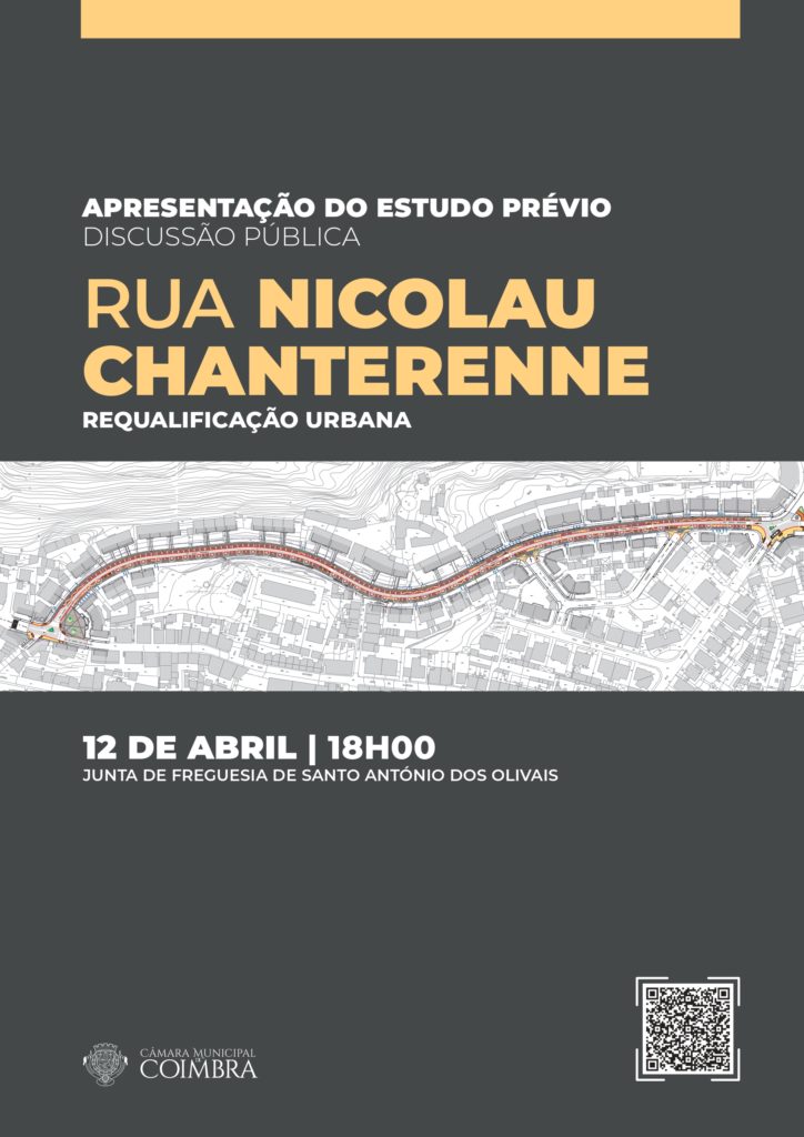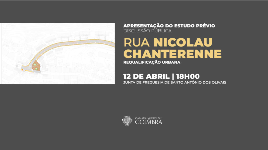 Com o objetivo de envolver os munícipes na discussão pública que está a decorrer e de recolher os contributos de todos os interessados, a Câmara Municipal (CM) de Coimbra promove na próxima sexta-feira, dia 12 de abril, pelas 18h00, em Santo António dos Olivais, uma sessão pública de apresentação onde vai ser dado a conhecer estudo prévio do projeto de “Requalificação da Rua Nicolau Chanterenne”. A sessão, que vai contar com a presença da vereadora do Urbanismo da CM de Coimbra, Ana Bastos que vai decorrer na Junta de Freguesia de Santo António dos Olivais.