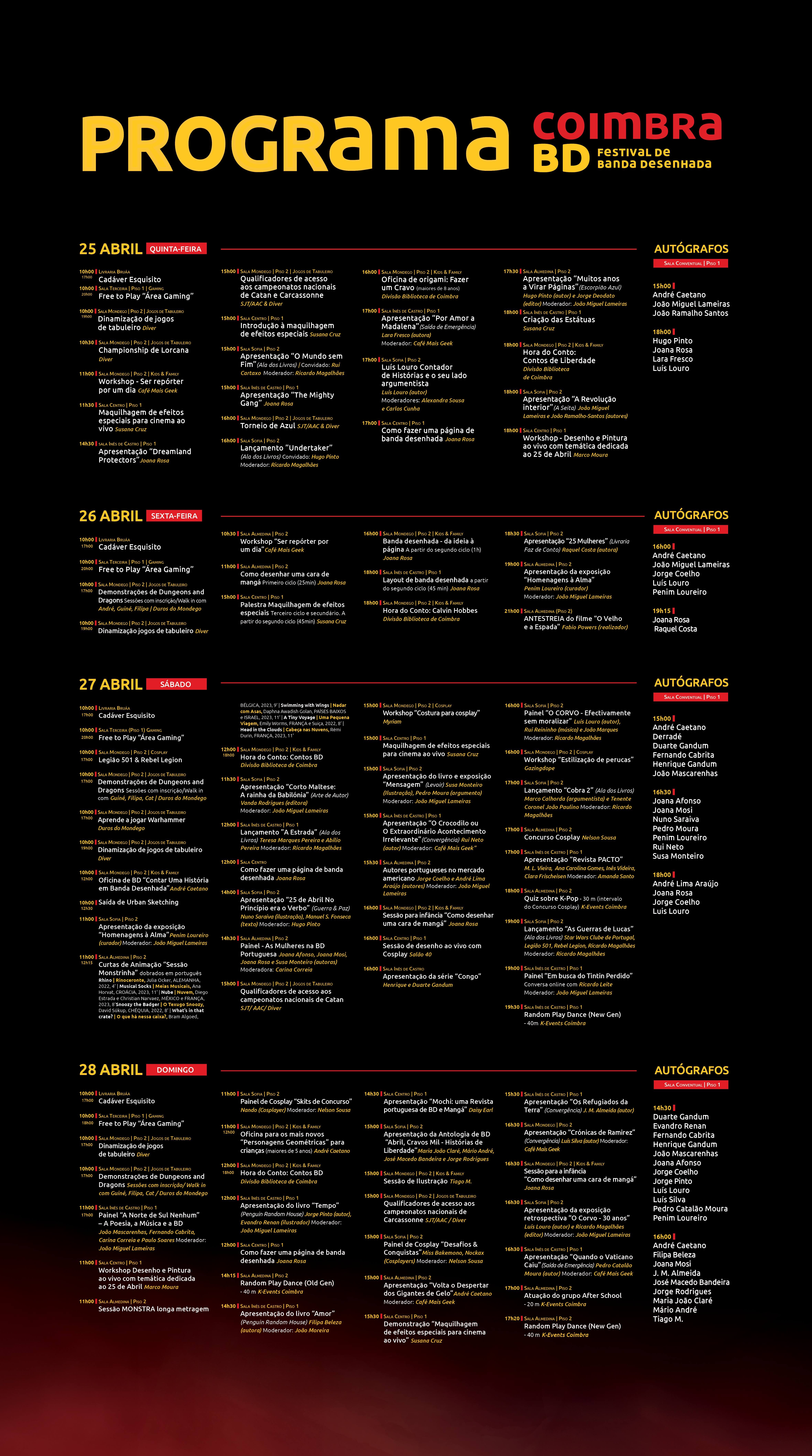 A Coimbra BD 2024 terá lugar entre 25 e 28 de abril no Convento São Francisco e estará aberta ao público entre as 10h e as 20h na quinta e sexta-feira e sábado e entre as 10h e as 18h no domingo. Todos os dias e atividades terão entrada livre. O evento tem a produção e programação da GuessTheChoice.