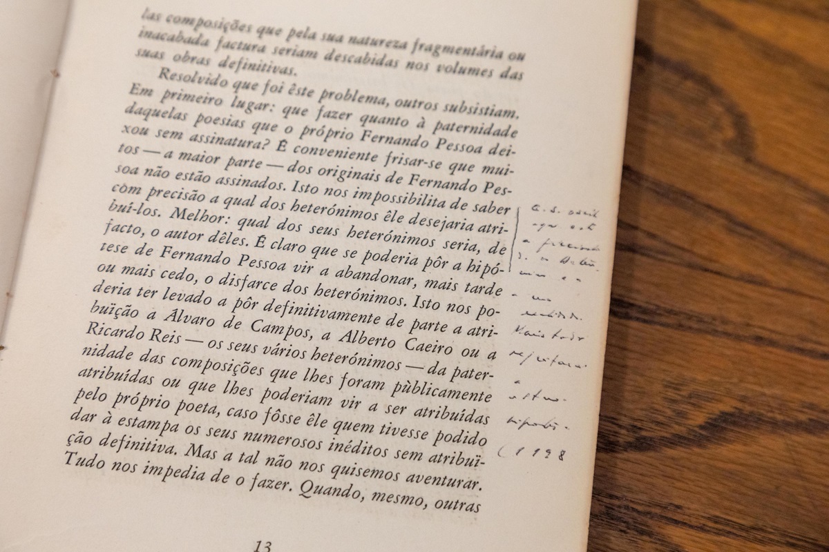 Eduardo Lourenço amava e precisava dos seus livros e, contudo, decidiu em vida deixá-los partir numa intenção evidente de dar a ler aos outros. Repartiu a sua biblioteca por entidades diversas, em várias cidades, cabendo à Biblioteca Geral da Universidade de Coimbra a parte da «Pessoana», livros de e sobre Fernando Pessoa, um dos seus grandes e heterodoxos interesses intelectuais. Separados por sua mão, segundo o seu próprio critério, são cerca de 500 obras, incorporadas em 2014, que se encontram tratadas e acessíveis no nosso catálogo integrado.