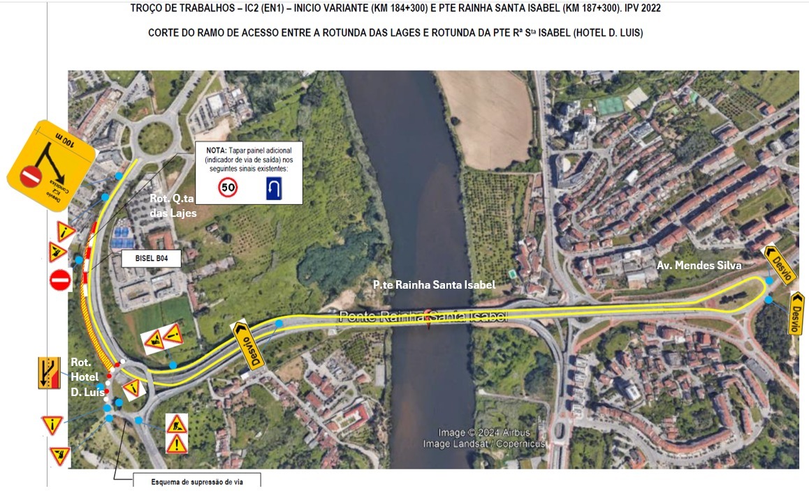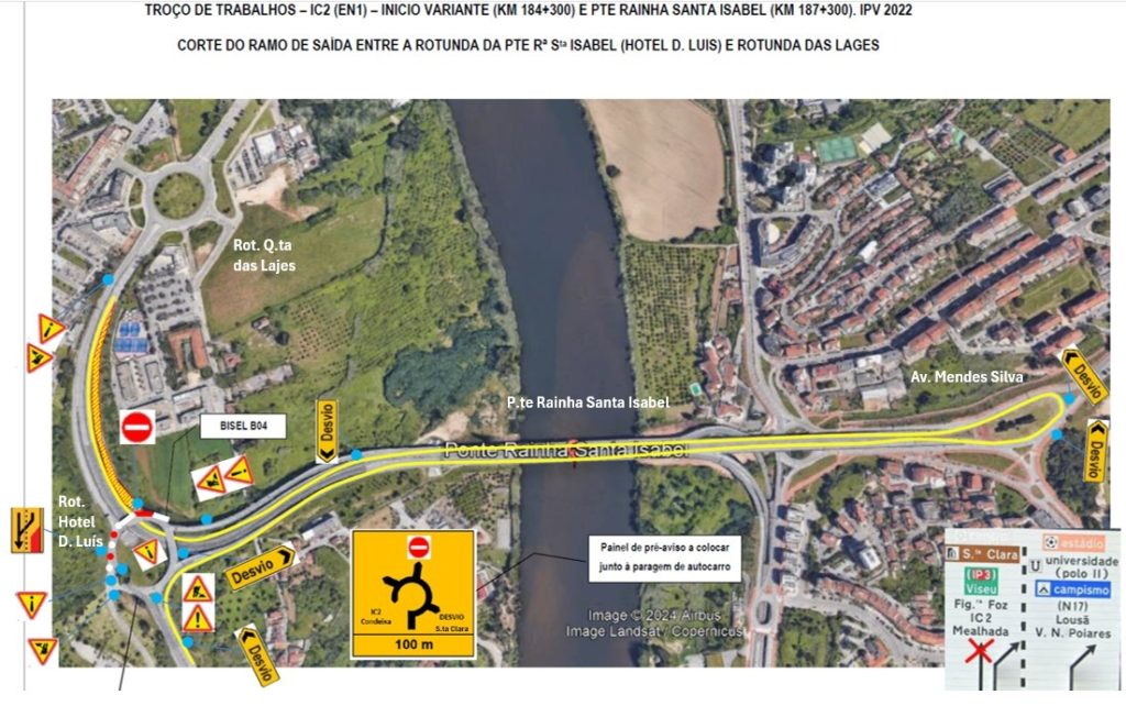 A alternativa passa pela utilização do percurso Ponte Rainha Santa Isabel, em direção à Avenida Mendes Silva, e novamente em direção à Ponte Rainha Santa Isabel, que vai estar devidamente assinalado e sinalizado, realçando-se que na zona da inversão de marcha junto à Avenida Mendes Silva será garantido que a via interior tem entrada direta para a ponte, sem perda de prioridade, de forma a dar fluidez ao fluxo que será obrigado a efetuar este percurso para acesso à rotunda da Quinta das Lajes.