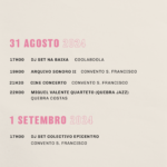 Sábado, dia 31, às 17h00, começa com um DJ Set com curadoria da Rádio Baixa, no Coola Boola. Às 19h00, rumamos ao Convento São Francisco, numa parceria com o projeto Dar a Ouvir do Serviço Educativo do Jazz ao Centro Clube (JACC) e do Convento São Francisco/Município de Coimbra, para escutar o resultado da residência artística Arquivo Sonoro II entre João Hasselberg, Rui Maia e Pedro Melo Alves que exploram o arquivo sonoro do Centro Histórico de Coimbra (asCHC) para construir um espetáculo tendo por base os sons da cidade. O asCHC é um projeto que nasceu em 2013, pouco tempo depois de o JACC ter encontrado casa no Salão Brazil. Dirigido pelo paisagista sonoro Luís Antero, o asCHC parte do princípio de que as paisagens sonoras são importantes para a compreensão do modo como o som carateriza um espaço, ou lugar. Questões como “Quais os sons que a nossa cidade incorpora?”; “Quanto deles já desaparecerem irremediavelmente?”; “O que podemos aprender acerca da especificidade das comunidades de uma cidade (comunidades espaciais, bairros, comunidades profissionais, etc.) através da dimensão sonora?” têm estado no centro do trabalho do Arquivo. A partir de 2016, o asCHC passou a estar disponível ao público para uma exploração artística, educativa e lúdica.