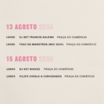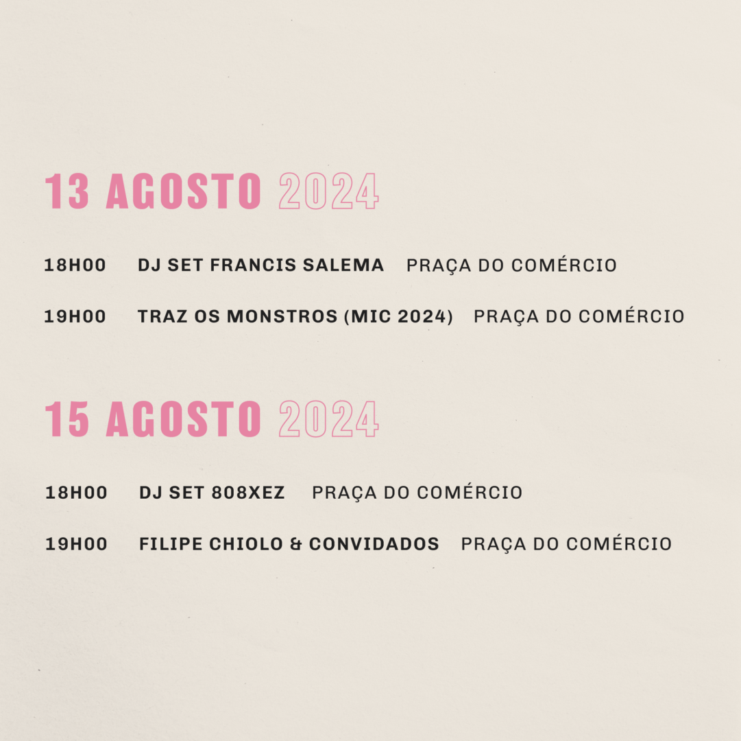 Como habitualmente, a semana do Verão a 2 Tempos * Epicentro inicia-se já amanhã, dia 13 de agosto, às 18h00, com o Dj Set de Francis Salema, no Palco Epicentro, na Praça de Comércio. No mesmo local, às 19h00, atua a banda Traz os Monstros, integrantes do MIC 2024, da Blue House. Os Traz os Monstros surgem como “filhos da quarentena” por Fábio Matos e Xavier Sousa, ligados pelos anos de amizade e de noites de jams insensatas e irresponsáveis por Coimbra.