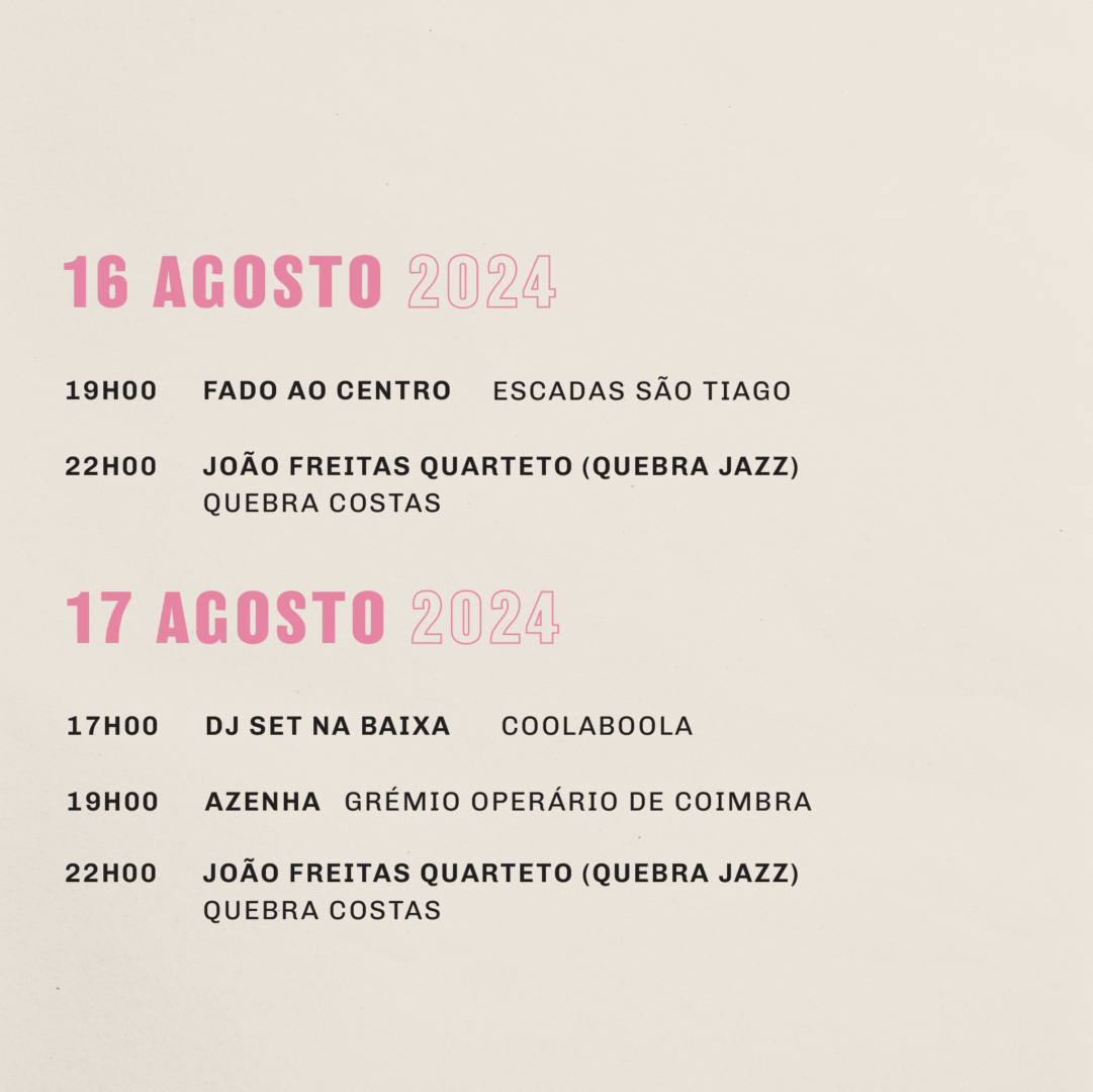 Já na sexta-feira, dia 16, às 19h00, é tempo de escutar fado de Coimbra, através da actuação do Fado ao Centro, colectivo com uma década de existência, na sua base com João Farinha (voz), Luís Barroso (guitarra portuguesa), Hugo Gambóias (guitarra portuguesa) e Luís C. Santos (viola), e que tem realizado concertos em inúmeros festivais de música internacionais, eventos culturais e em muitas das mais prestigiadas salas de espetáculos por todo o mundo, cumprindo a sua missão de defender e divulgar o Fado de Coimbra. Às 22h00, numa parceria com a 15ª edição do Festival das Artes Quebra Jazz, atua o João Freitas Quarteto, nas Escadas do Quebra Costas. O concerto repete no dia seguinte também às 22h00 e no mesmo local.