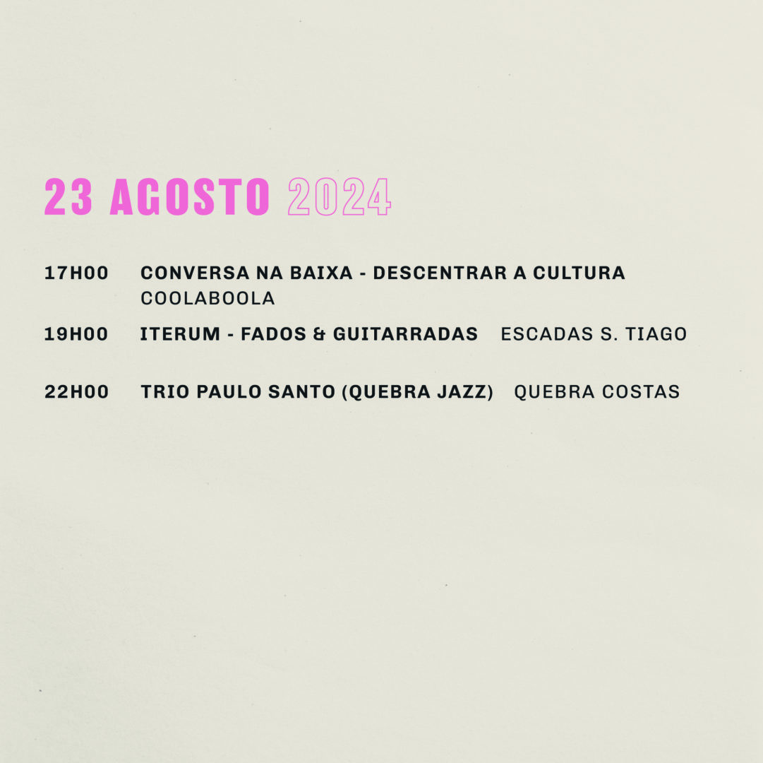 Sexta-feira, dia 23, começa, às 17h00, com uma Conversa na Baixa, no Coola Boola. Desta vez a temática é sobre a descentralização da cultura e como os meios de comunicação podem ajudar nessa mudança, com a presença de Miguel Rocha, escrevedor na Playback, no Rimas e Batidas e no Público e de António Matos Silva, programador do ZigurFest. Às 19h00, nas Escadas de São Tiago, vai ser tempo de escutar fado de Coimbra, através do projeto “Iterum – Diogo Alves | Guilherme Catela“. Com o objetivo de estudar e aprofundar o seu conhecimento sobre a canção de matriz coimbrã, nomeadamente fados, guitarradas, baladas e baladas a viola, bem como dar vida a alguns temas que, com o passar dos anos, foram caindo no esquecimento, o grupo conta ainda com a presença do cantor Manuel Moura Pinheiro, nascido em Coimbra.