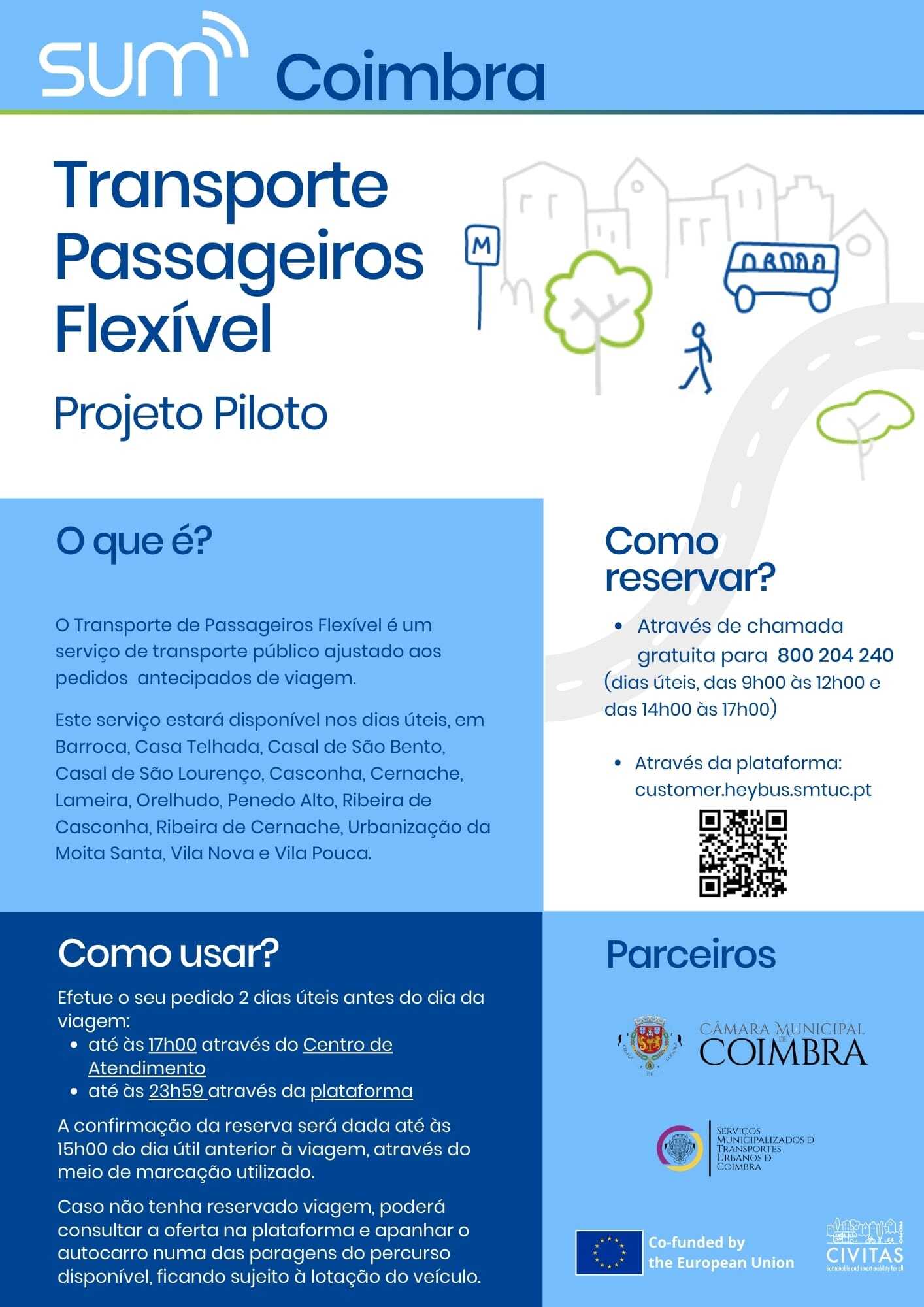 Recorde-se que a Câmara Municipal e os SMTUC iniciaram o projeto piloto com um inquérito online sobre a mobilidade na União de Freguesias de Assafarge e Antanhol e na Freguesia de Cernache, com o objetivo de caraterizar o serviço atual e perceber como avançar para o modelo a realizar, sempre como foco no objetivo de transformar as redes de mobilidade atuais em novos e inovadores sistemas de mobilidade partilhados e integrados.
