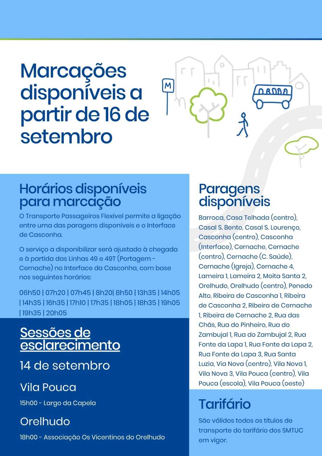 A Câmara Municipal (CM) de Coimbra vai promover duas sessões de esclarecimentos, amanhã, dia 14 de setembro, sobre o projeto piloto que está a desenvolver, em conjunto com os Serviços Municipalizado de Transportes Urbanos de Coimbra (SMTUC), designado por Transporte de Passageiros Flexível (TPF), integrado no projeto SEAMLESS SHARED URBAN MOBILITY, na União de Freguesias de Assafarge e Antanhol e na Freguesia de Cernache. Este novo serviço visa oferecer uma solução de transporte público ajustada às necessidades de viagem dos utilizadores, proporcionando flexibilidade e eficiência no transporte coletivo. As sessões realizam-se amanhã, às 15h00, no Largo da Capela, em Vila Pouca, e às 18h00, na Associação Os Vicentinos do Orelhudo.