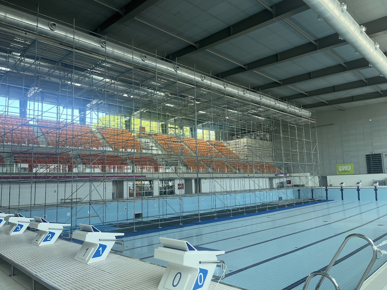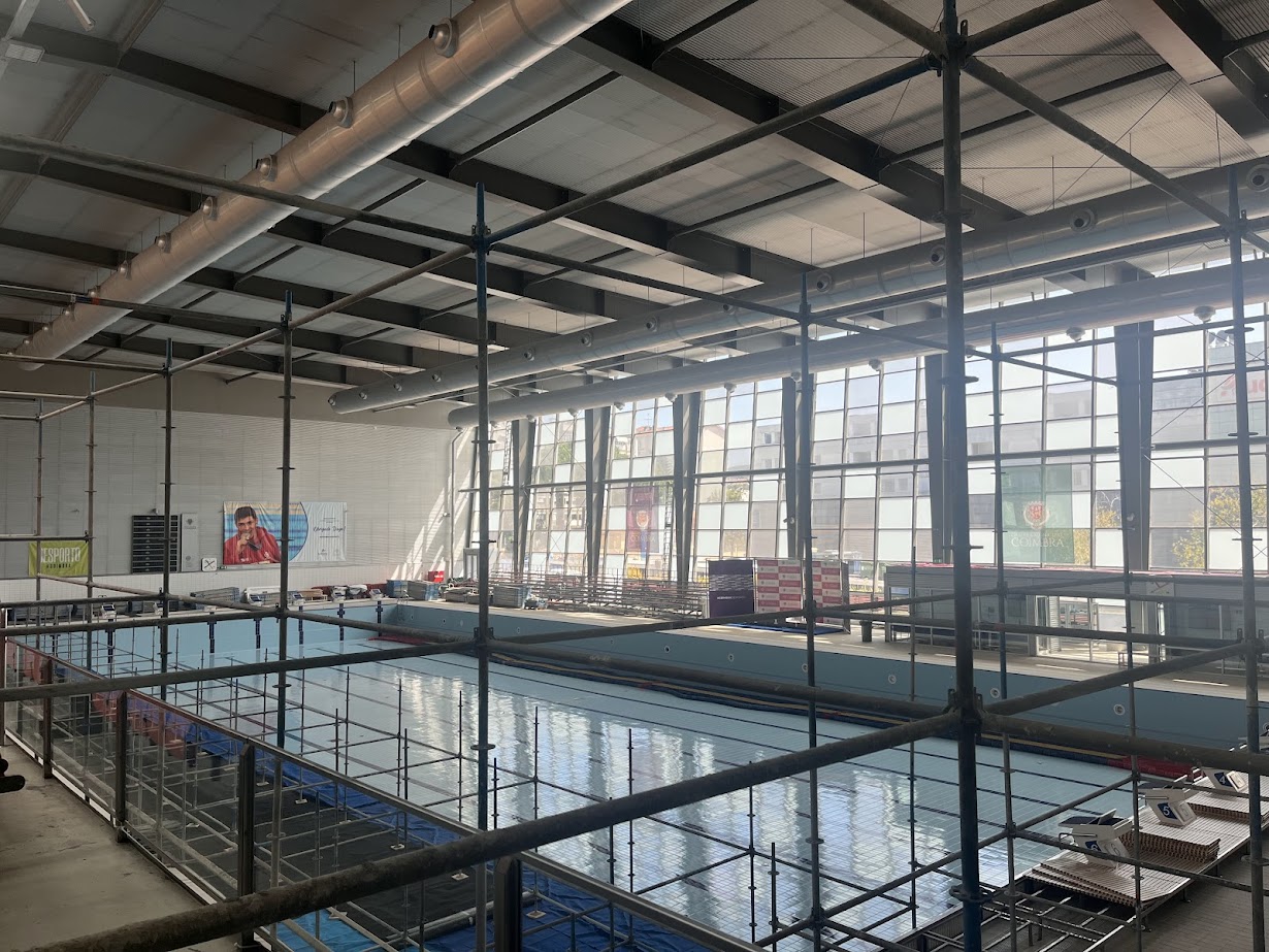 Os trabalhos a desenvolver na piscina de 50m são de manutenção especializada do sistema de ancoragem de duas condutas de insuflação de AVAC (situadas na nave da piscina de 50m), que necessitam de manutenção e de substituição dos apoios de suporte das condutas, uma vez que, devido ao ambiente corrosivo e agressivo das piscinas, intensivo durante estes quase 20 anos, evidenciam desgaste. Os trabalhos são mais exigentes do que a habituais manutenções periódicas e vão obrigar à desmontagem de condutas, à verificação e desmontagem dos suportes existentes, à verificação e instalação de novos suportes, à remontagem da chapa ondulada perfurada existente da cobertura, à limpeza e desinfeção interior das condutas, à limpeza e desinfeção de difusores e à verificação de portas de limpeza e remates em forra de alumínio das portas de visita nas tubagens da zona da nave da piscina olímpica.
