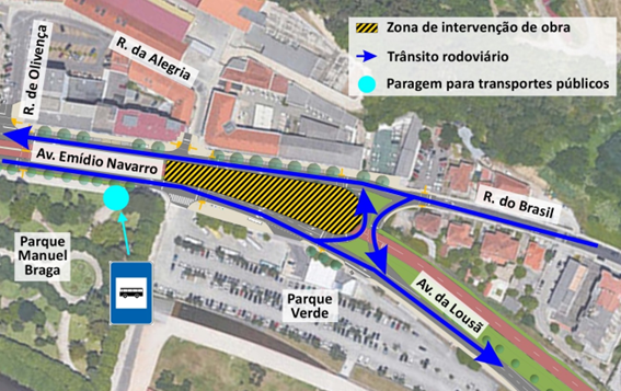 Assim, durante este período, o trânsito proveniente da Rua de Olivença e da Rua da Alegria com a intenção de ir para a Avenida da Lousã, terá de inverter a marcha na rotunda da Portagem.