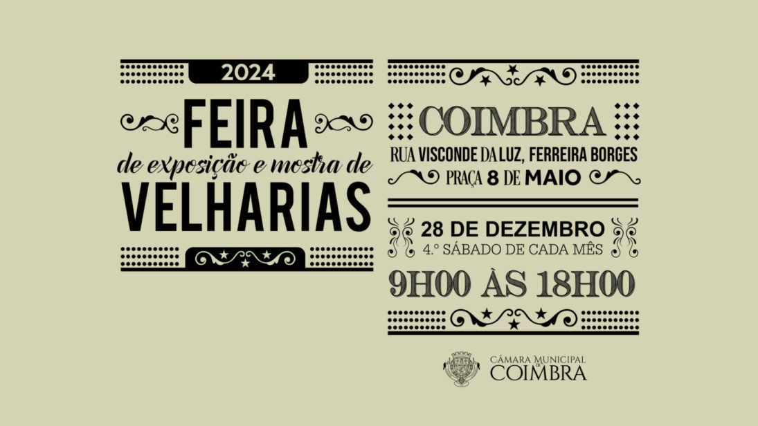 No próximo sábado, dia 28 de dezembro, o CM de Coimbra leva a cabo a última Feira de Velharias de 2024 que, devido à montagem de um dos palcos do Fim de Ano, vai ser transferida, nesta edição, para a Praça 8 de Maio e Rua Visconde da Luz, nas proximidades do espaço físico onde ultimamente tem decorrido o evento.
