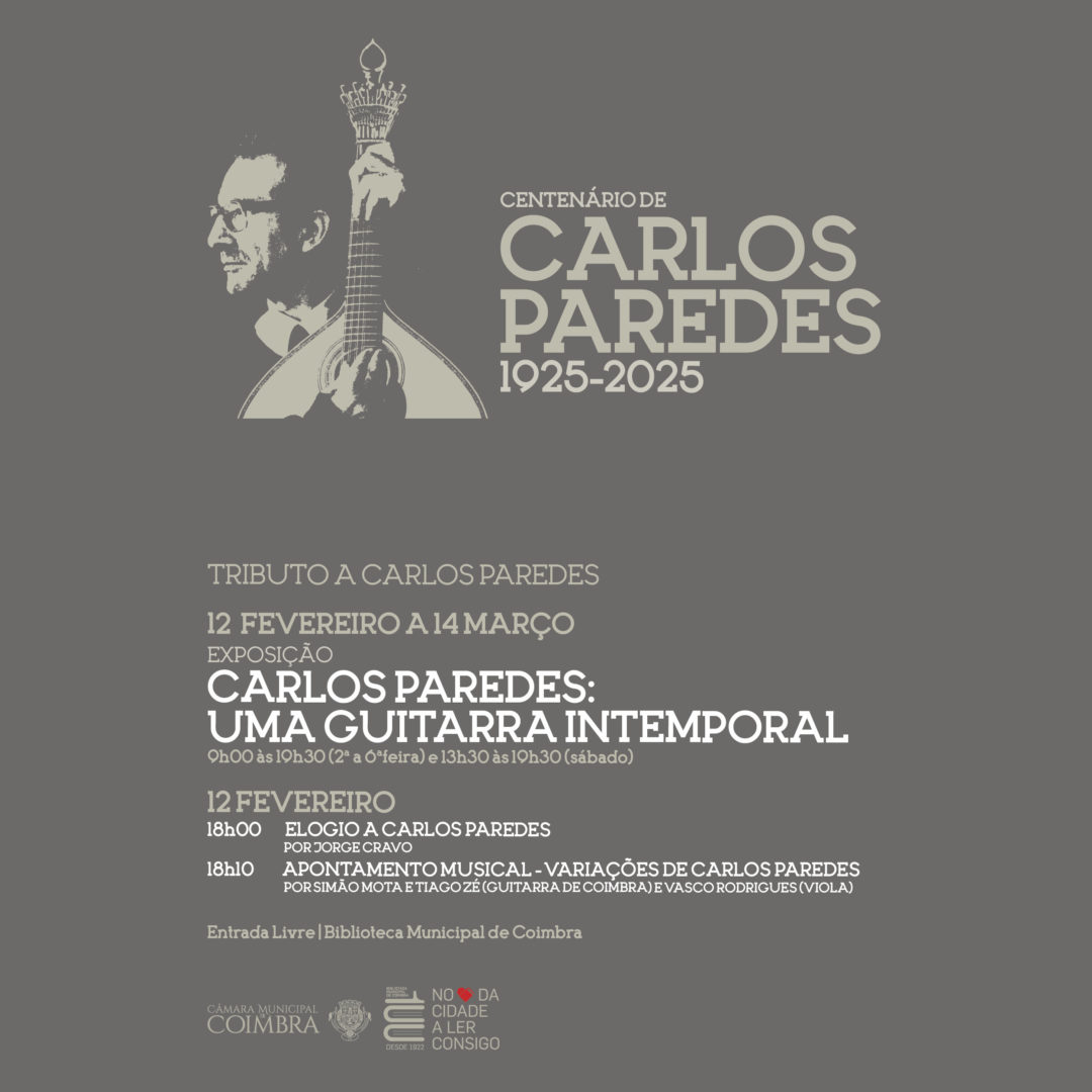 As comemorações do centenário do nascimento de Carlos Paredes continuam a surgir no universo municipal. No próximo dia 12 de fevereiro, a Câmara Municipal (CM) de Coimbra vai inaugurar a mostra “Carlos Paredes: Uma Guitarra Intemporal”, na sala do serviço de empréstimo da Biblioteca Municipal. A mostra pode ser visitada gratuitamente, de segunda a sexta-feira, das 9h00 às 19h30, e aos sábados das 13h30 às 19h30, até ao dia 14 de março.