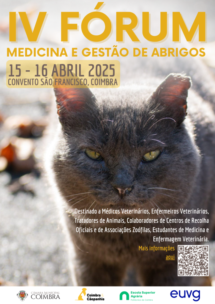 A quarta edição do Fórum de Medicina e Gestão de Abrigos, que irá decorrer nos dias 15 e 16 de abril, no Convento São Francisco, em Coimbra, vai debater temas relevantes, como Prevalência de Doenças Infeciosas Zoonóticas, Sobrepopulação de cães numa perspetiva One Health, Resgate Técnico de Pequenos e Grandes Animais, Alojamento e Bem-estar de cães e gatos, Comportamento Canino e Reabilitação Social, e Contaminação Parasitária dos Parques Públicos em Coimbra.