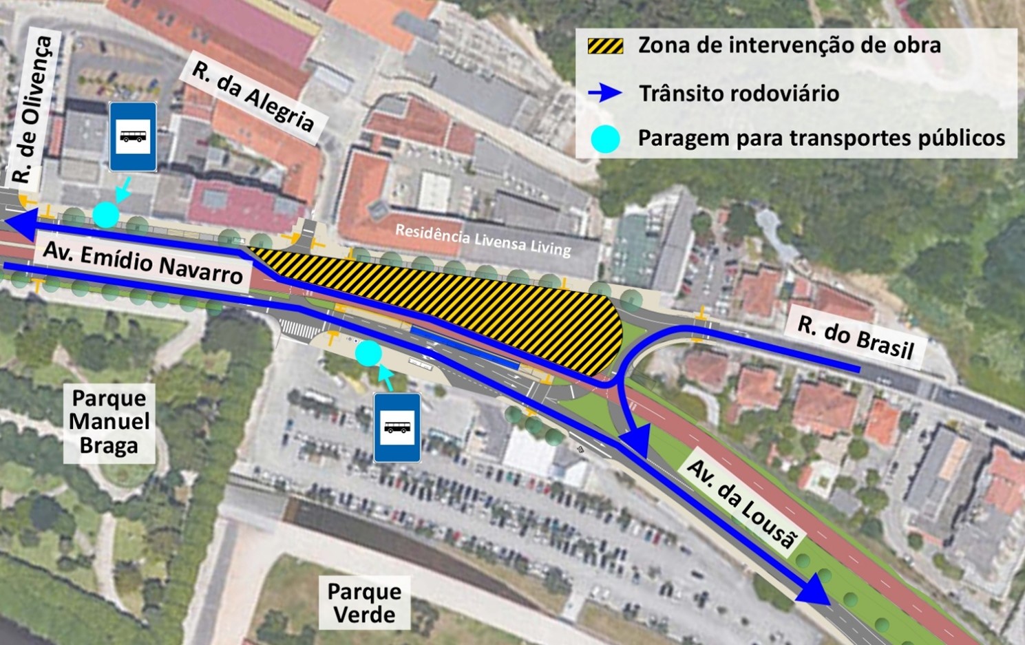 Durante este período, serão efetuados trabalhos na faixa rodoviária junto ao edifício da residência de estudantes Livensa Living, designadamente execução de infraestruturas (saneamento, telecomunicações, pluviais), pavimentação e integração urbana.