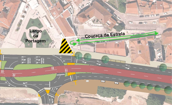 Este condicionamento servirá para viabilizar a execução dos necessários trabalhos de infraestruturas pluviais, residuais e elétricas (serviços afetados), duas caixas de visita e trabalhos de pavimentação na zona assinalada na seguinte imagem: