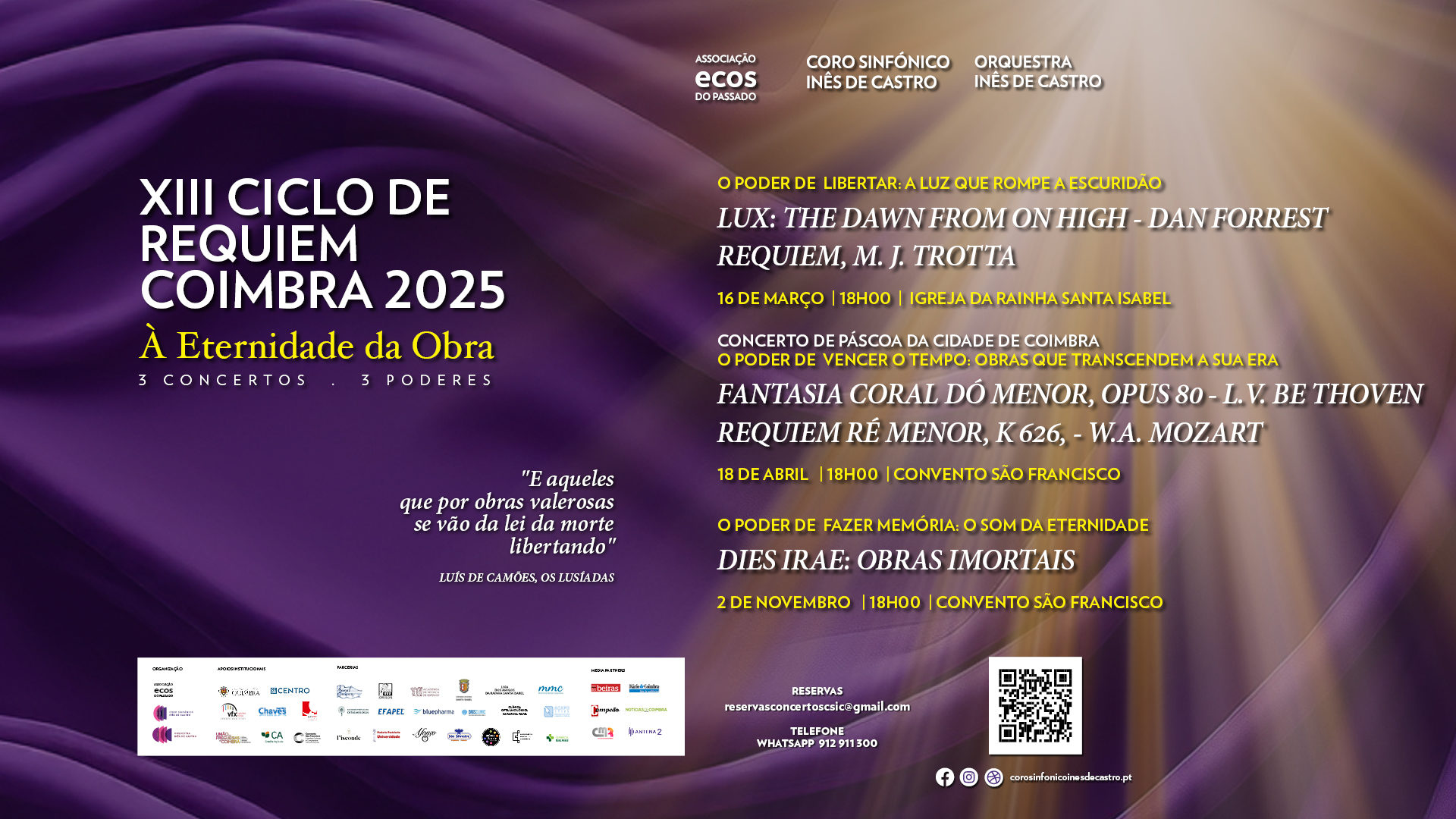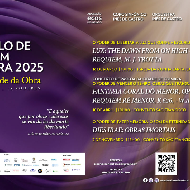 O “XIII Ciclo de Requiem Coimbra 2025”, sob o lema “À Eternidade da Obra”, inspira-se na preposição de “Os Lusíadas”, numa homenagem aos grandes compositores e às suas obras imortais. Numa alusão aos 500 anos do nascimento de Camões, o evento une o poder evocativo da obra camoniana com a monumentalidade das composições escolhidas para apresentar na cidade de Coimbra, mas, também, noutras três cidades do país: Chaves, Régua e Vila Franca de Xira.