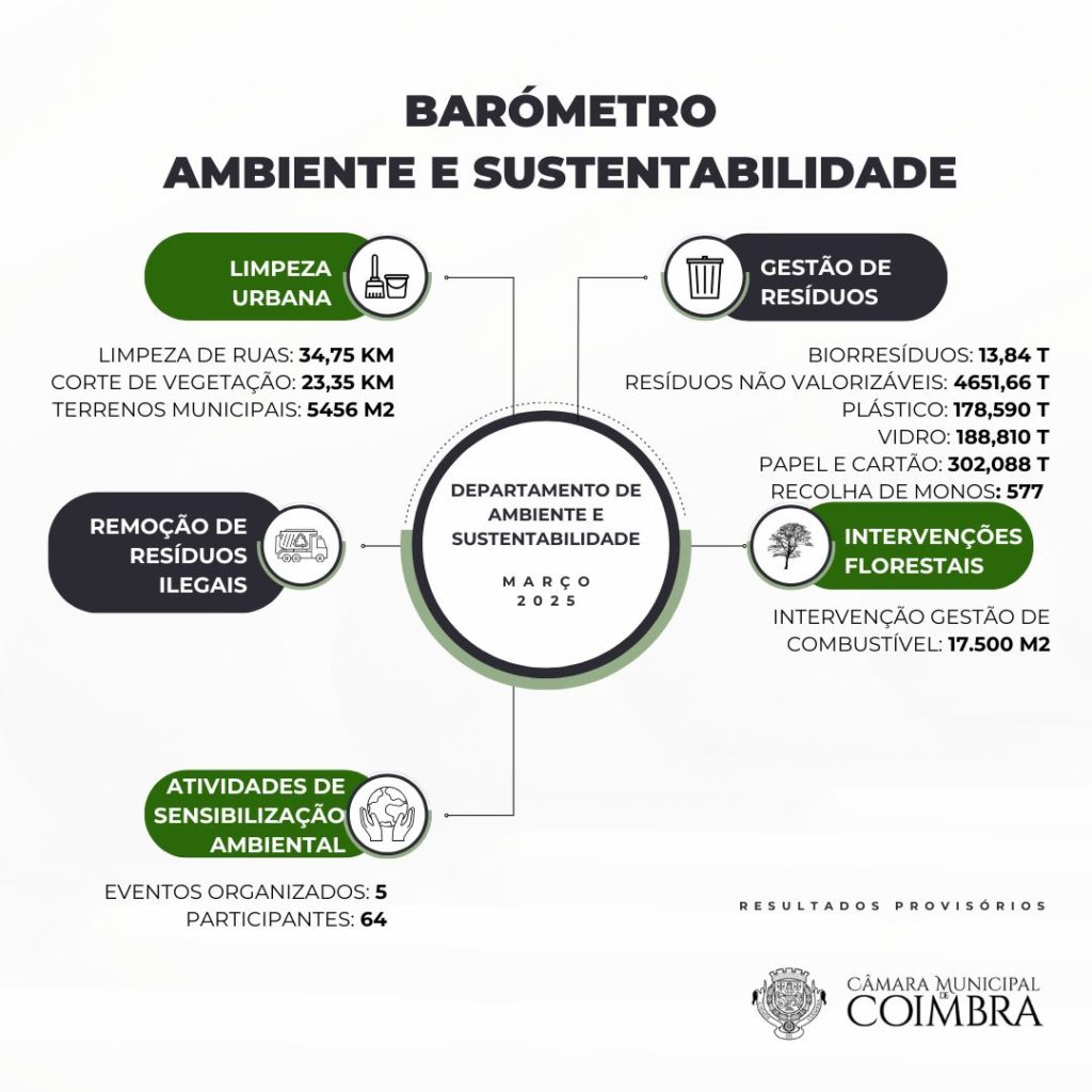 As equipas municipais estão no terreno, todos os dias, com diversas intervenções, para assegurar a qualidade de vida dos cidadãos de Coimbra e preservar o seu património natural. E, durante o mês de março, na área da Gestão de Resíduos, foram recolhidas 13,84 toneladas de biorresíduos, 4.651,66 toneladas de resíduos não valorizáveis, 178,590 toneladas de plástico, 188,810 toneladas de vidro e 302,088 toneladas de papel e cartão. Foram recolhidos ainda 577 monos, por agendamento.
