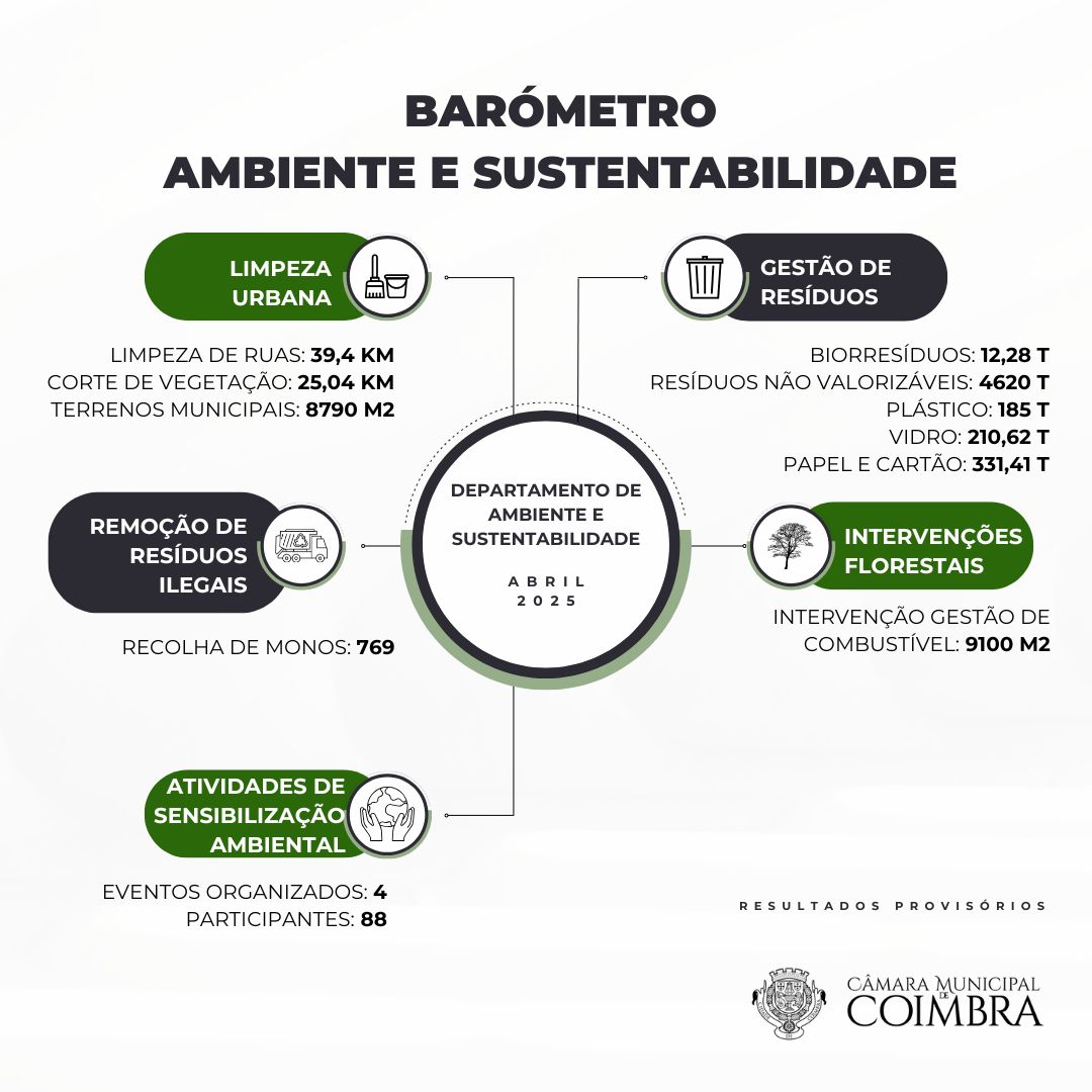 As equipas municipais estão no terreno, todos os dias, com diversas intervenções, para assegurar a qualidade de vida dos cidadãos de Coimbra e preservar o seu património natural. Durante o mês de abril, na área da Gestão de Resíduos, foram recolhidas 12,28 toneladas de biorresíduos, 4.620 toneladas de resíduos não valorizáveis, 185 toneladas de plástico, 210,62 toneladas de vidro e 331,41 toneladas de papel e cartão. Foram recolhidos ainda 769 monos, por agendamento.