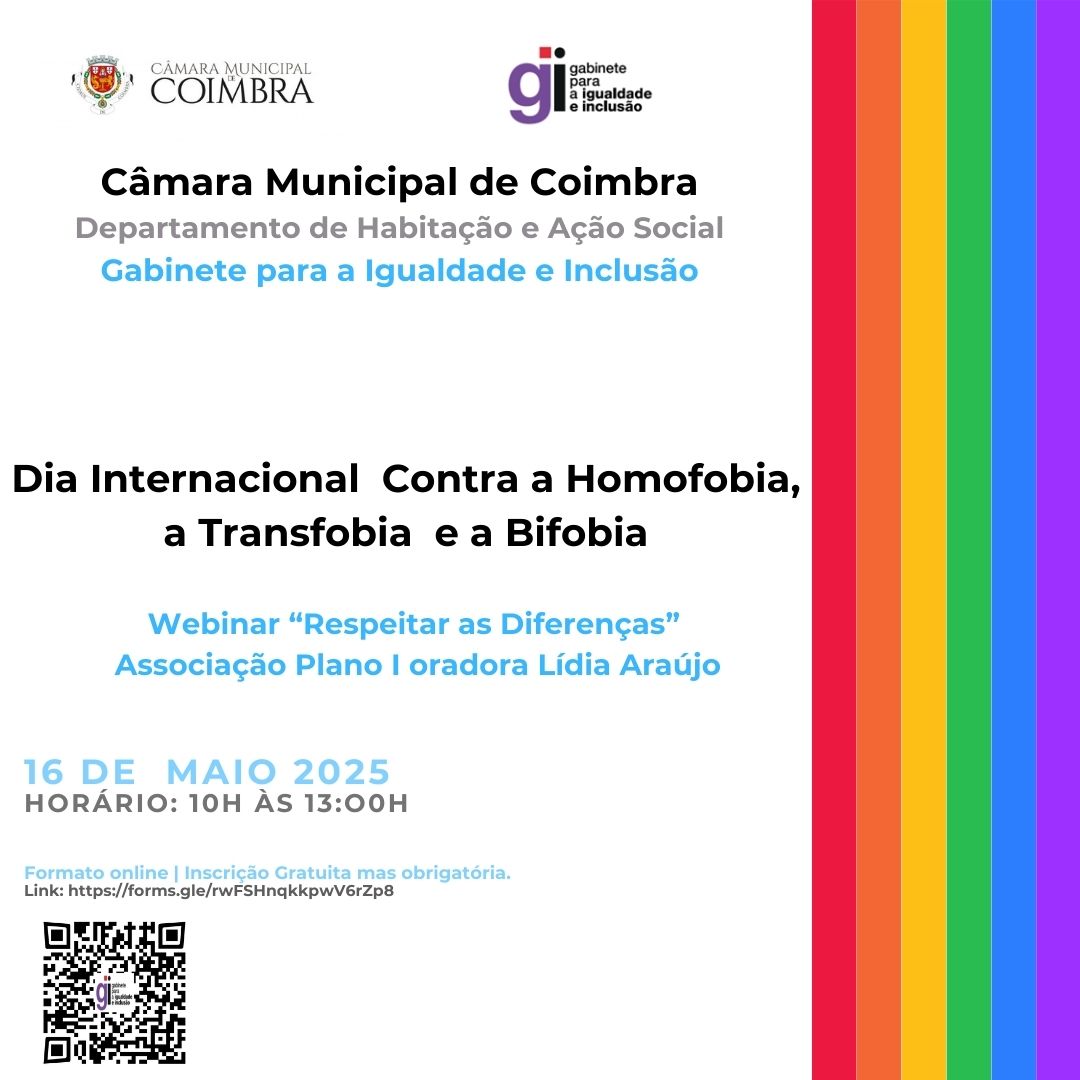 No dia 16 de maio, quinta-feira, a CM de Coimbra, através do Gabinete para a Igualdade e Inclusão, promove o webinar “Respeitar as Diferenças”, dinamizado pela Associação Plano i (Porto), entre as 10h00 e as 13h00, na plataforma Teams. A ação, orientada por Lídia Araújo, destina-se a docentes, profissionais de saúde, técnicos/as de SAAS e outros profissionais, sendo gratuita, mas de inscrição obrigatória. O objetivo é fomentar a reflexão sobre o respeito pela diversidade e pelos direitos das pessoas LGBTI+, contribuindo para uma sociedade mais inclusiva.