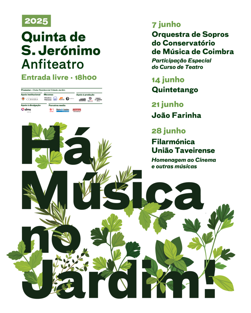 Criado em 2014, o ciclo “Há Música no Jardim” oferece à cidade um conjunto de concertos e experiências sonoras ao ar livre, com uma forte componente educativa e cultural. A programação aposta na valorização de jovens músicos em formação, sem descurar a presença de projetos emergentes e artistas consagrados. Em todos os espetáculos, a ligação à cidade de Coimbra é um elemento central, envolvendo músicos, grupos e bandas locais num ambiente de proximidade e fruição cultural.
