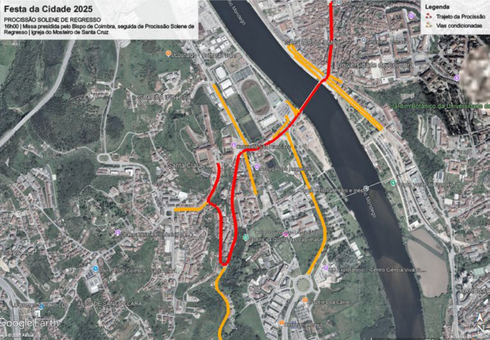 Na Avenida Emídio Navarro, a procissão segue junto ao rio, invertendo nas proximidades da Estação Nova e regressando à Portagem pelo canal do Metro Mondego, retomando o percurso habitual pela Rua Ferreira Borges. Durante o corte, as vias no sentido Sul–Norte junto à Sanfil e ao Hotel Astória vão funcionar como corredor de emergência.