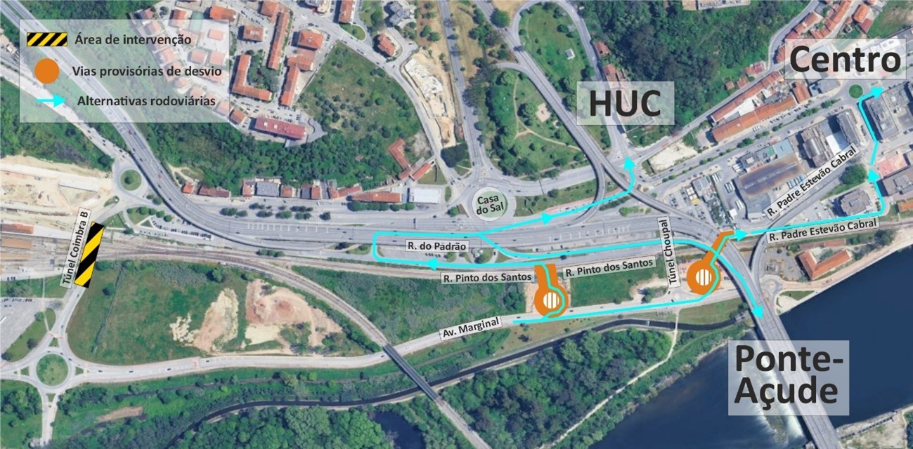 Durante este período, os automobilistas poderão utilizar os circuitos alternativos apresentados na imagem infra, por recurso aos desvios implementados na zona do Túnel do Choupal e que possibilitam o acesso à Avenida Fernão de Magalhães a partir da Rua Pinto dos Santos.