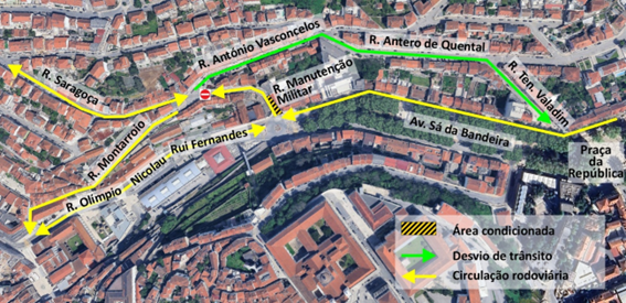 Assim, a intervenção será efetuada num troço de 50 metros junto ao cruzamento com a Avenida Sá da Bandeira, com a circulação a efetuar-se apenas no sentido ascendente em direção à Rua de Saragoça. A alternativa para aceder da Rua de Saragoça à Avenida Sá da Bandeira será realizada pelas ruas António Vasconcelos, Antero de Quental e Tenente Valadim.