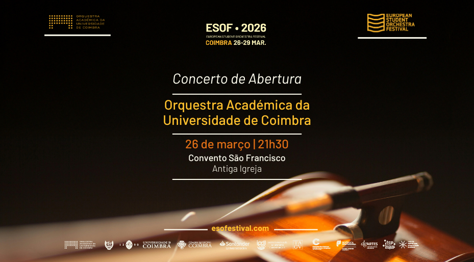 O ESOF 2026 reúne, em vários locais da cidade, orquestras universitárias de toda a Europa para celebrar a música sinfónica académica. O festival, organizado pela Orquestra Académica da Universidade de Coimbra, em parceria com a Universidade de Coimbra, a Tuna Académica da Universidade de Coimbra e a Câmara Municipal de Coimbra, constitui uma plataforma de intercâmbio cultural, colaboração artística e desenvolvimento profissional entre músicos universitários de todos os cursos. Programa completo aqui.