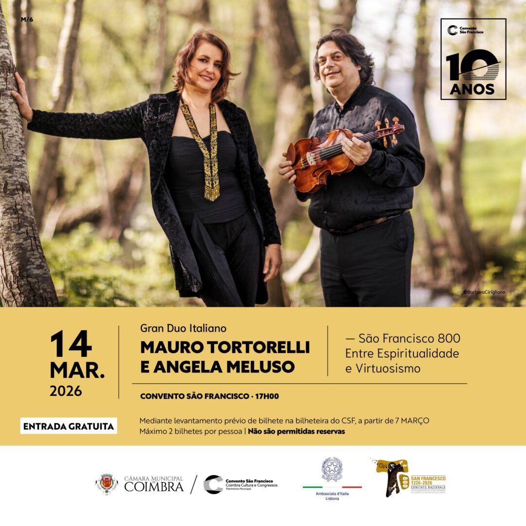 A Antiga Igreja do Convento São Francisco recebe, no sábado, dia 14, às 17h00, o concerto “São Francisco 800 – Entre a Espiritualidade e o Virtuosismo”, pelo Gran Duo Italiano. O espetáculo, coorganizado pela Embaixada de Itália em Portugal e pela Câmara Municipal de Coimbra, assinala os 800 anos da morte de São Francisco de Assis. A entrada é gratuita, mediante levantamento prévio de bilhete, na bilheteira deste equipamento municipal.