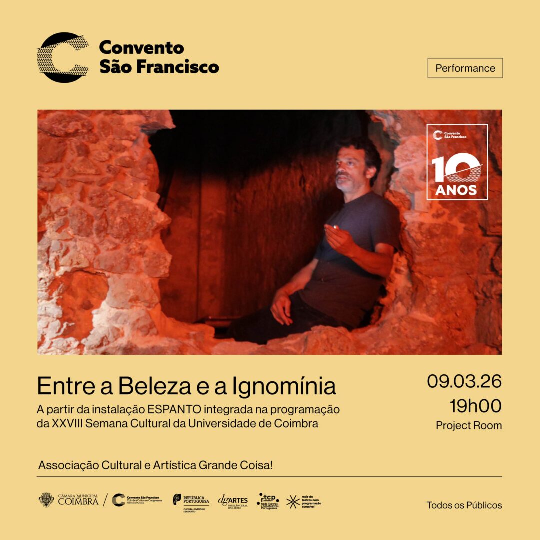 A partir da instalação “Espanto”, hoje, dia 9 de março, pelas 19h00, com o mote “Entre a Beleza e a Ignomínia”, decorre uma performance poética promovida pela Associação Cultural e Artística Grande Coisa! (ACAGC!) no Convento São Francisco. A instalação, promovida pela ACAGC! no âmbito da Semana Cultural da Universidade de Coimbra, está patente na Galeria Project Room, até 26 de março. A instalação de entrada livre, e que convida o público a experiências sensoriais e criativas, pode ser visitada, diariamente, entre as 15h00 e as 20h00, sendo a última entrada permitida até às 19h30.